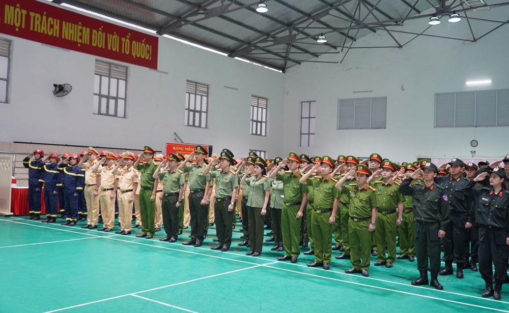 Cán bộ, chiến sĩ công an thực hiện nghi lễ chào cờ, hát Quốc ca. Ảnh: Đình Hợp