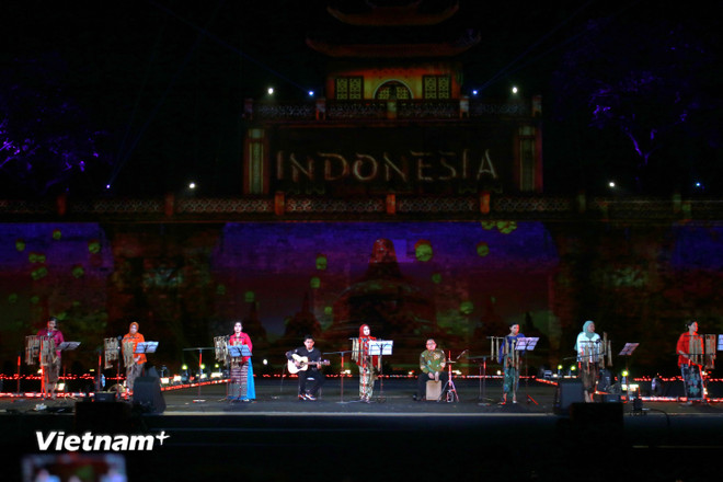 Các nghệ sỹ Indonesia với màn trình diễn “Hello Việt Nam” không lời bằng đàn thùng, trống cajoon và đàn gỗ Angklung truyền thống. (Ảnh: Minh Anh/Vietnam+)