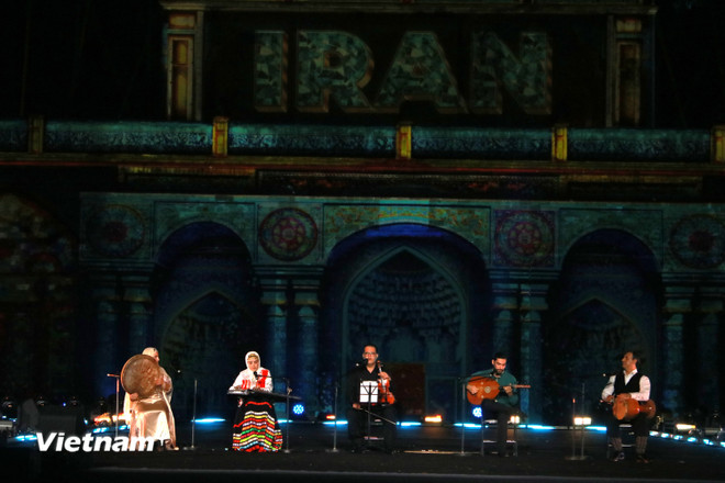 Tác phẩm "Bình minh" bằng loạt nhạc cụ truyền thống và Vĩ cầm của ban nhạc Sar Afshan từ Iran. (Ảnh: Minh Anh/Vietnam+)