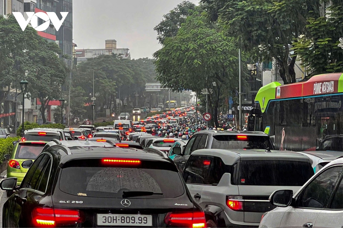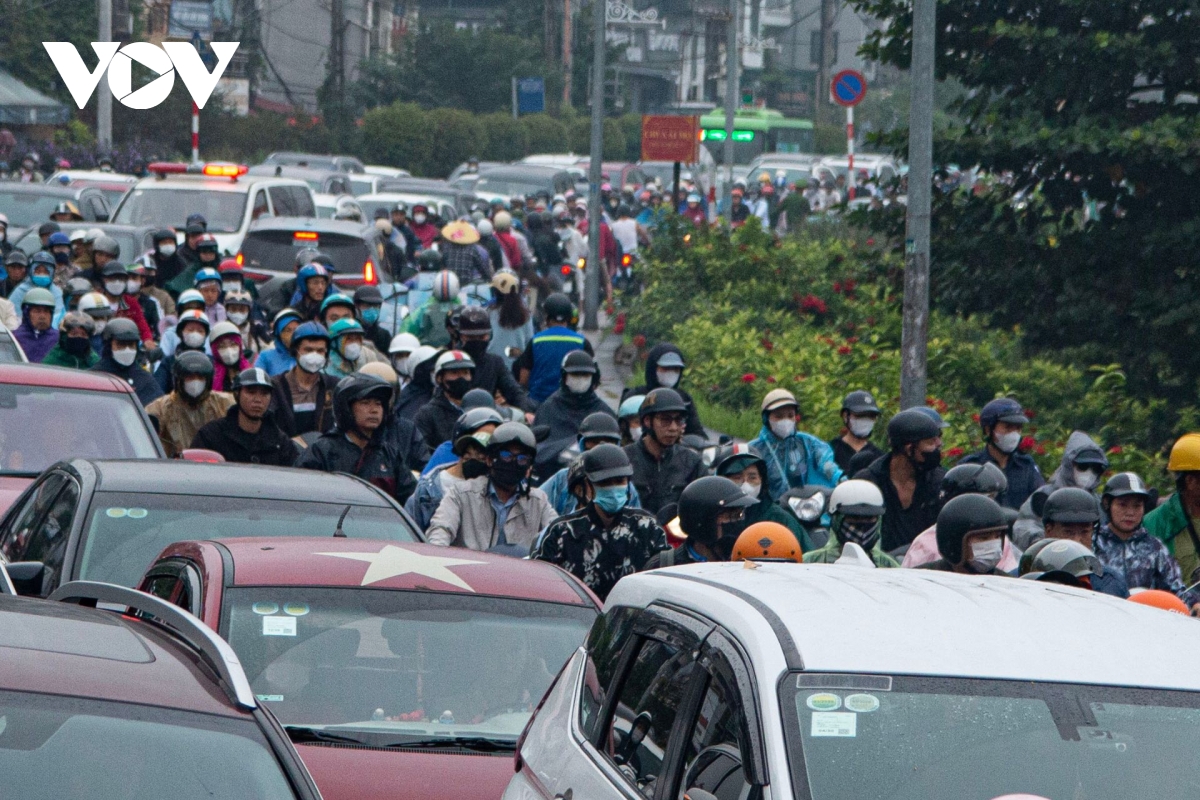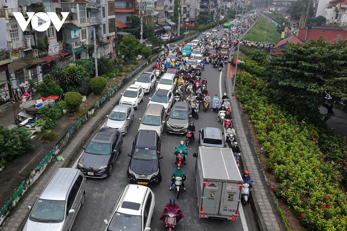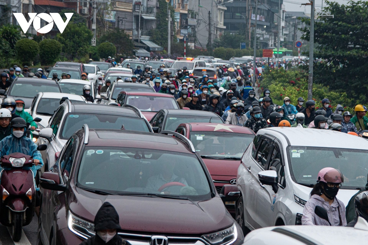 Trong tiết trời mưa lạnh sáng sớm, cả nghìn phương tiện nối đuôi nhau trên đường đê Xuân Quan dẫn lên cầu Chương Dương. Dòng xe máy ken đặc, ô tô gần như “đứng hình” tại chỗ, tạo nên cảnh ùn tắc nghiêm trọng kéo dài hàng trăm mét.