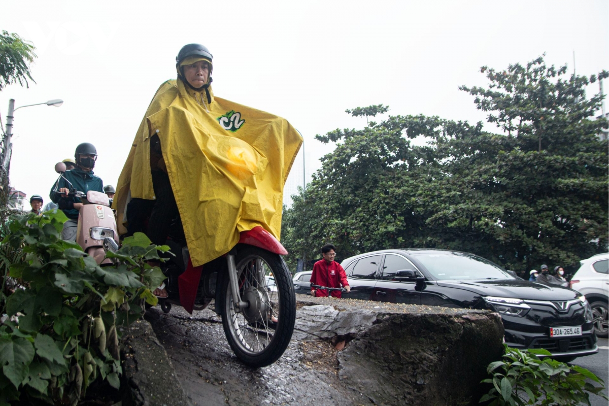Chị Mai Thu (đội mũ trắng, trú tại quận Long Biên, Hà Nội) cho biết, do đoạn đường nhỏ, dốc cao và ùn tắc vì nhiều phương tiện cùng lưu thông, chị buộc phải đi bộ xuống đường để đợi đồng nghiệp đón nhằm đảm bảo an toàn: “Từ ngày cầu Long Biên bị cấm lưu thông, tôi phải đi sớm hơn bình thường khoảng 15-20 phút, tùy vào thời tiết. Như hôm nay trời mưa, lại là đầu tuần, tôi phải đi sớm hơn tới 30 phút để kịp giờ làm và đưa con đi học”, chị Thu chia sẻ nhanh.