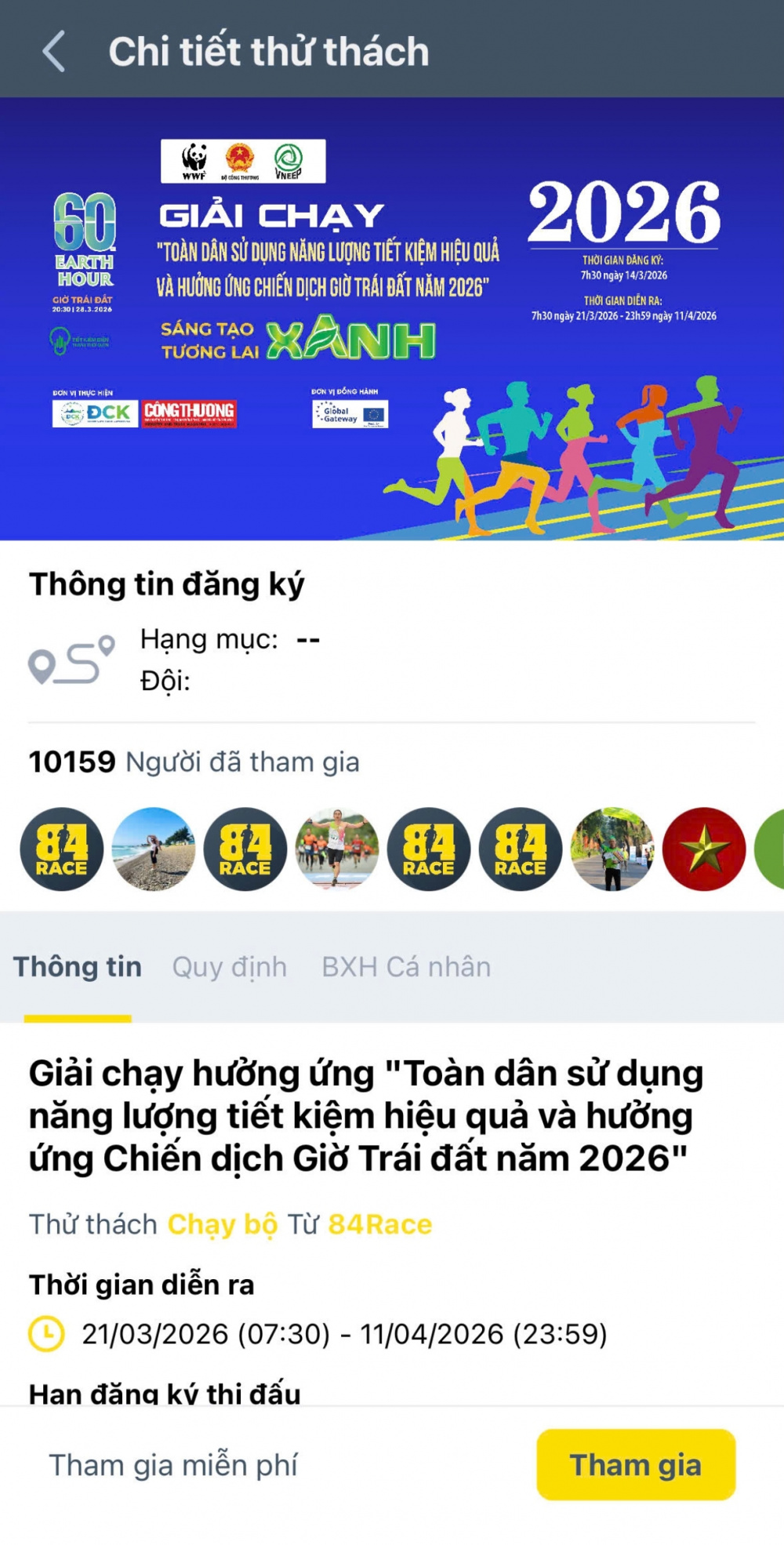 Truy cập nền tảng 84RACE, lựa chọn Giải chạy “Toàn dân sử dụng năng lượng tiết kiệm, hiệu quả và hưởng ứng Chiến dịch Giờ Trái đất năm 2026”.