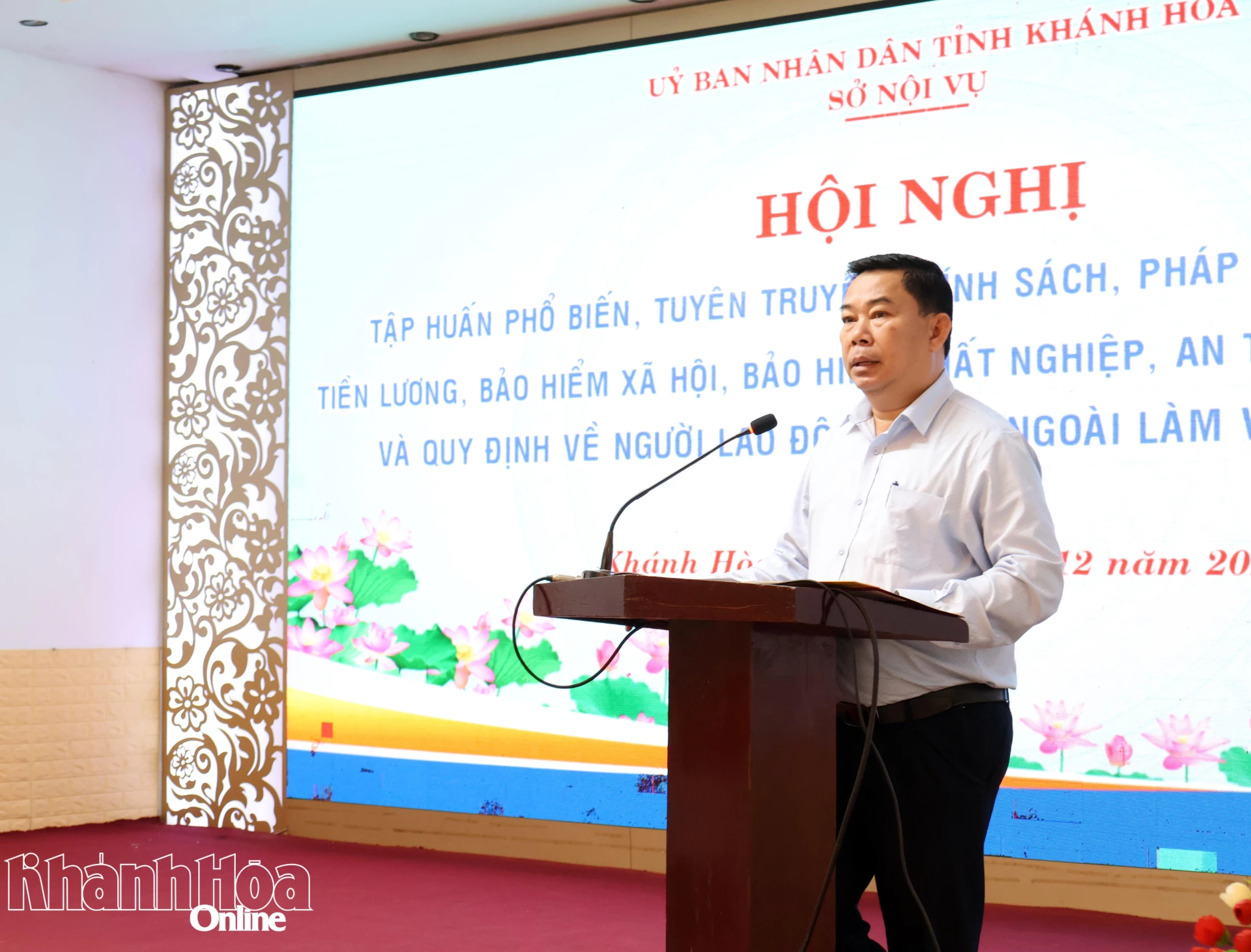 Ngày 10-12, tại phường Phan Rang, Sở Nội vụ tỉnh Khánh Hòa tổ chức hội nghị tập huấn, phổ biến, tuyên truyền chính sách, pháp luật về lao động, tiền lương; bảo hiểm xã hội, bảo hiểm thất nghiệp; an toàn, vệ sinh lao động và quy định về người lao động nước ngoài làm việc tại Việt Nam cho hơn 100 doanh nghiệp trên địa bàn tỉnh.