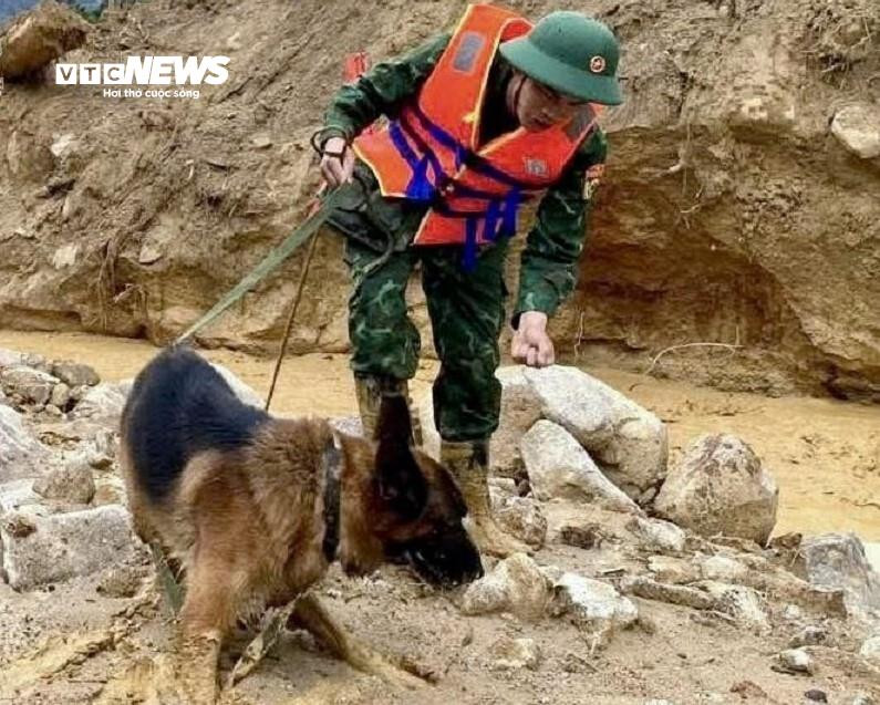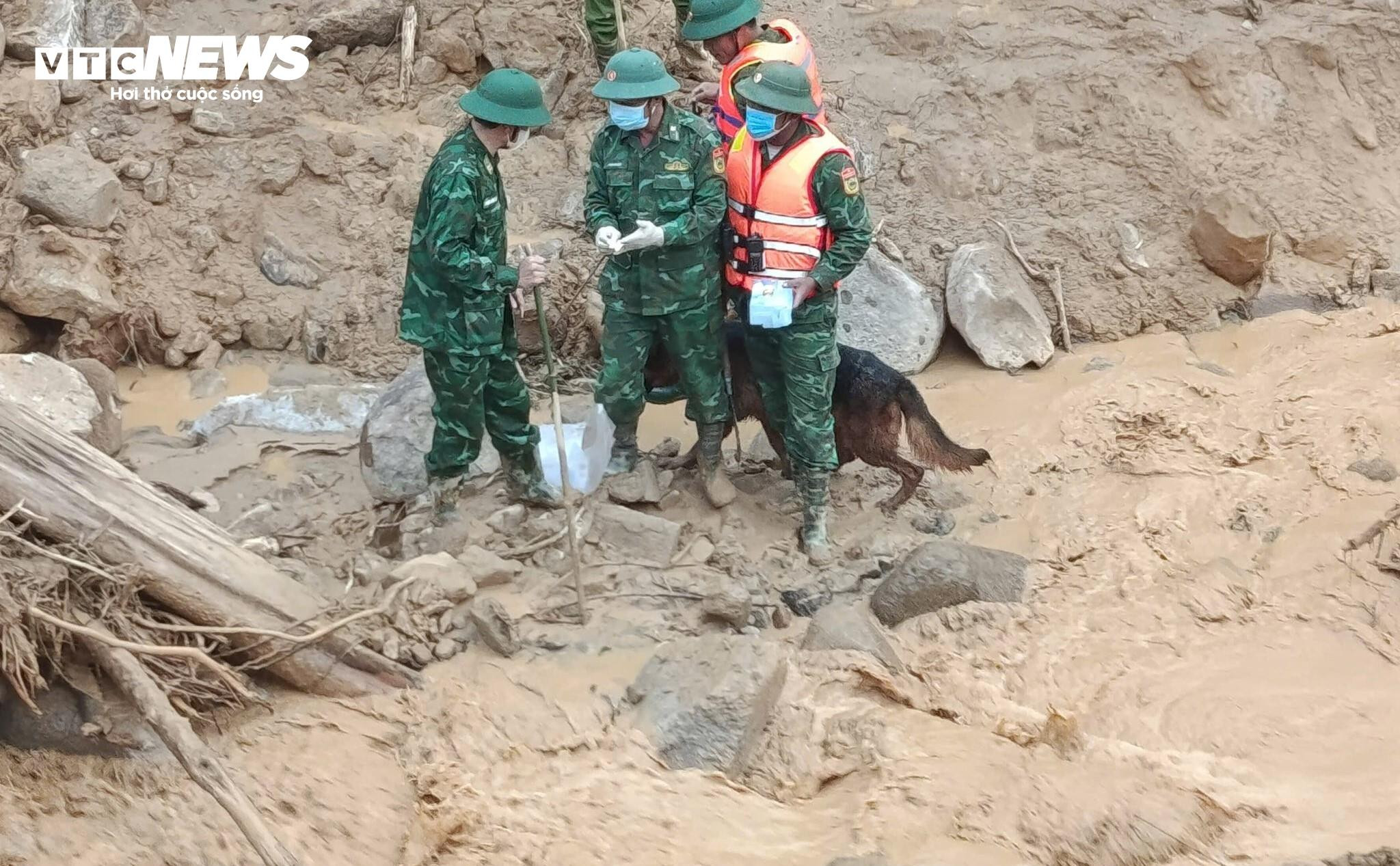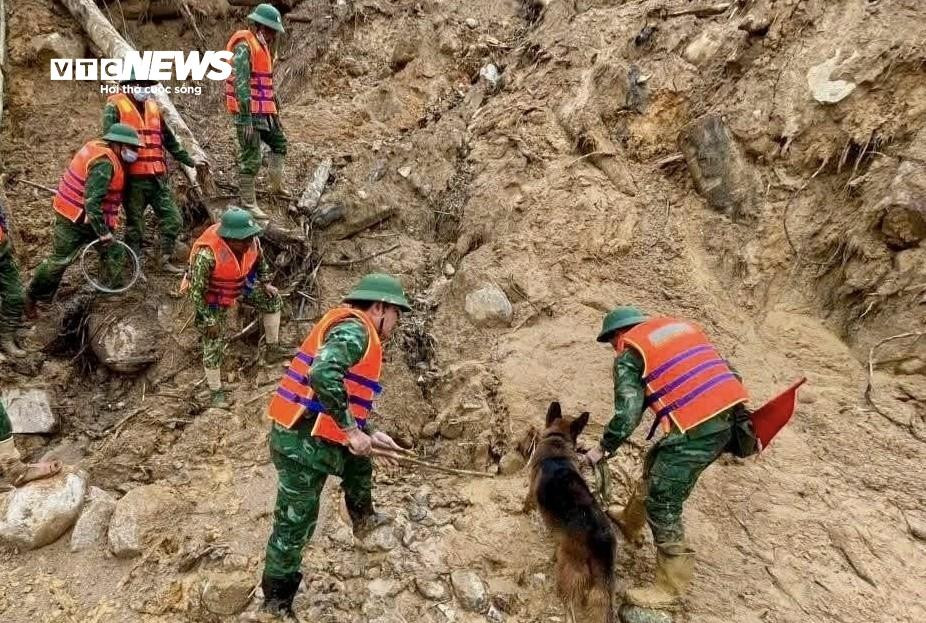 Ngoài hàng trăm cán bộ, chiến sĩ, 3 chó nghiệp vụ vẫn đang túc trực ở hiện trường để tìm kiếm các nạn nhân nghi bị vùi lấp dưới lớp đất đá, bùn nhão - nơi các phương tiện cơ giới khó tiếp cận. (Ảnh: S.H)