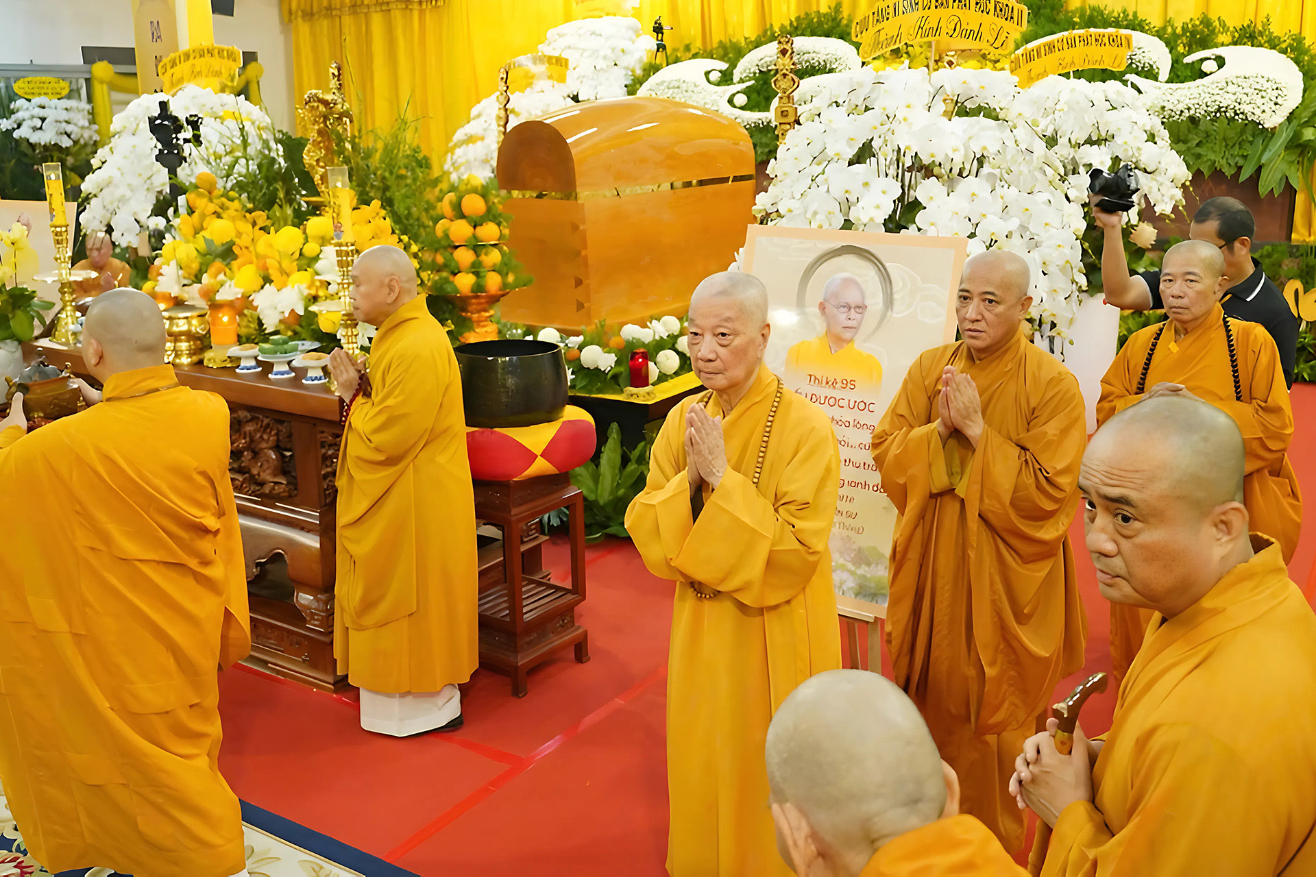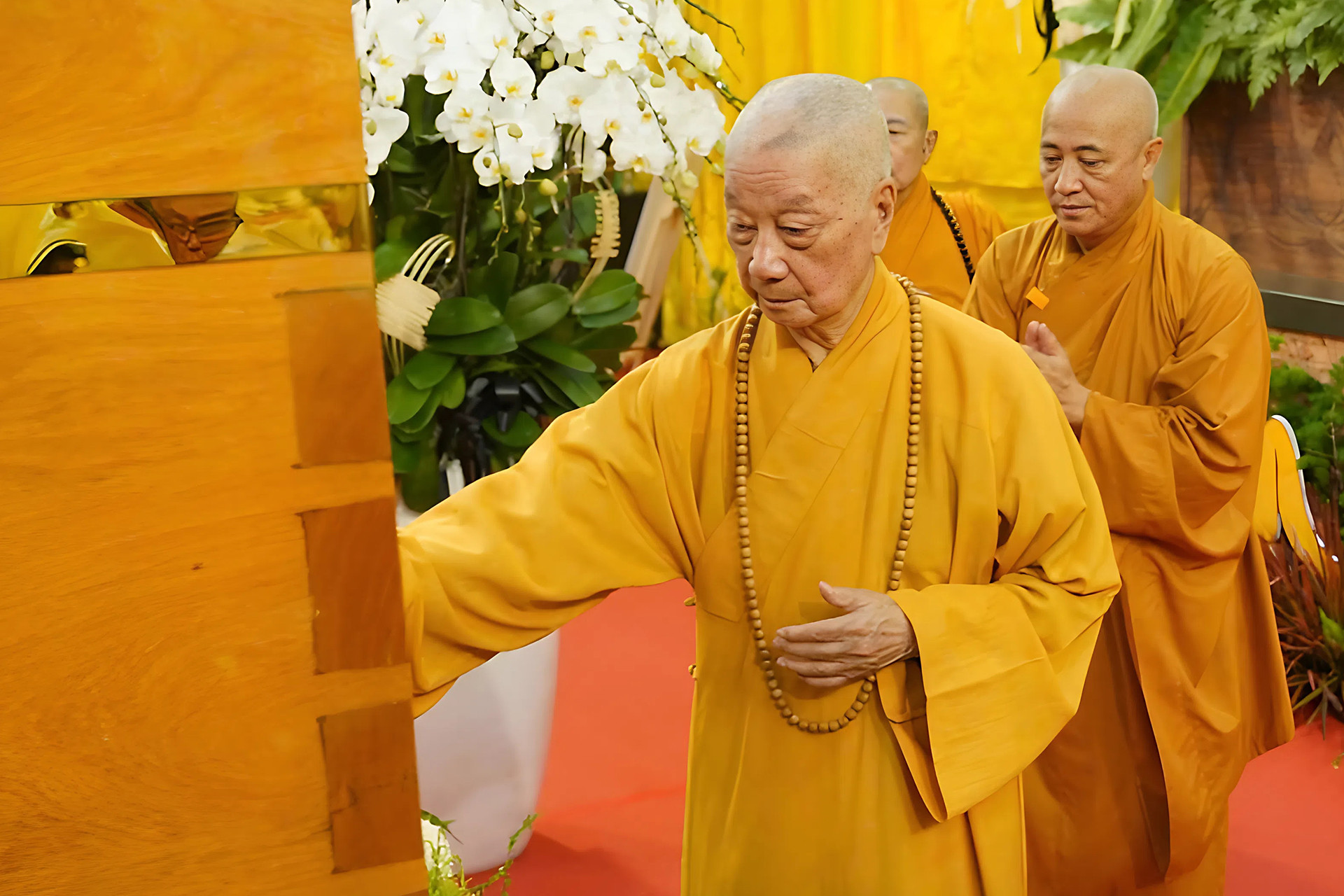 Trước nơi tôn trí kim quan, Đức Pháp chủ đã mặc niệm, dâng hương cầu nguyện và nhiễu kim quan, tiễn biệt bậc thầy gần một thế kỷ gắn bó với Phật giáo Việt Nam.