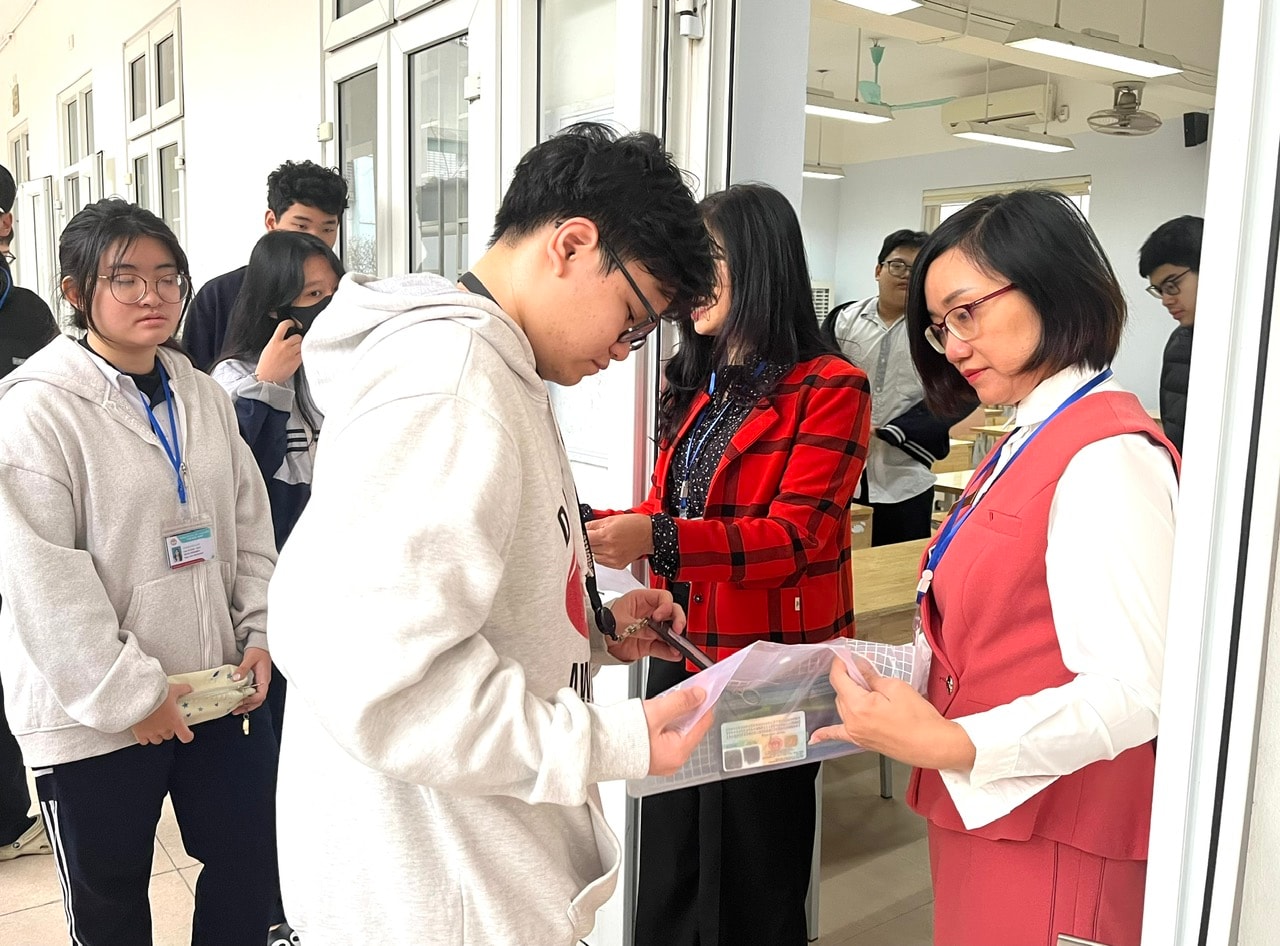 Theo các em, dù 7h30 mới phát đề kiểm tra, nhưng nhà trường thông báo sẽ gọi học sinh vào phòng sớm hơn để ổn định tổ chức. Vì vậy, nhiều em chủ động đến trường từ sớm để xem sơ đồ phòng kiểm tra, kiểm tra lại số báo danh và chuẩn bị các vật dụng được phép mang vào phòng theo quy định.