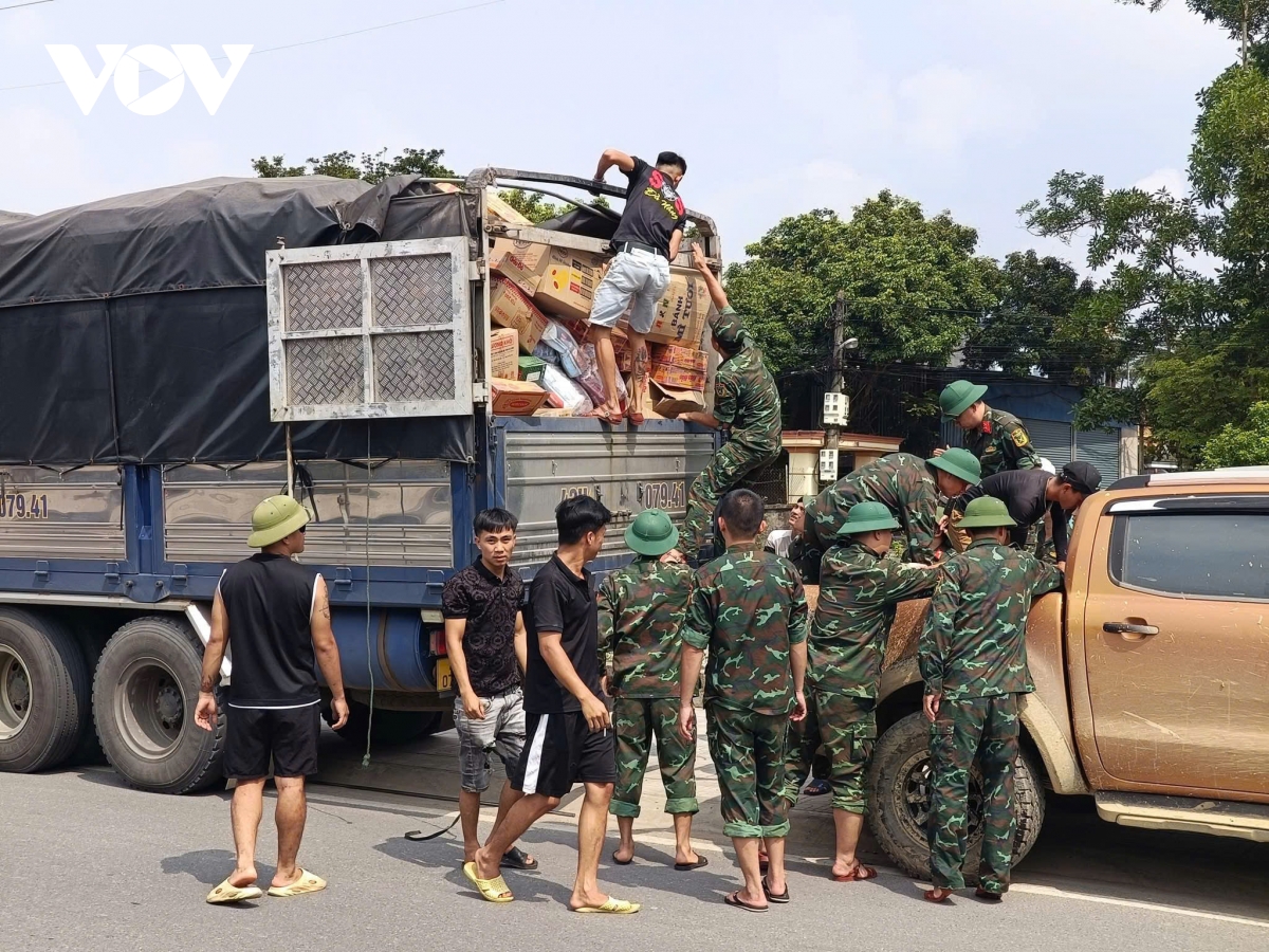 Lực lượng quân đội hỗ trợ đưa những lô hàng cứu trợ đến với nhân dân vùng bão lũ