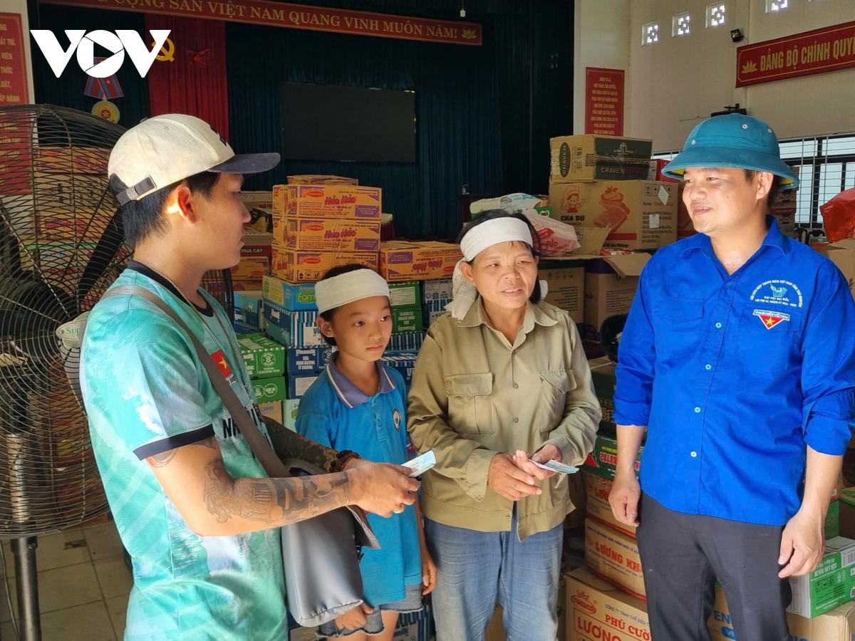 Anh Quốc Thịnh, Trưởng đoàn cứu trợ đến từ thành phố Đà Nẵng chia sẻ: “Qua phương tiện thông tin, không chỉ tôi mà tất cả bà con ở Đà Nẵng đều thấy bà con vùng lũ quá vất vả, nên hôm nay, tôi đến đây gửi những món quà của bà con Đà Nẵng như mì tôm, lương khô, gạo, lương khô, bánh mỳ…để hỗ trợ bà con khó khăn vùng lũ Thái Nguyên”.