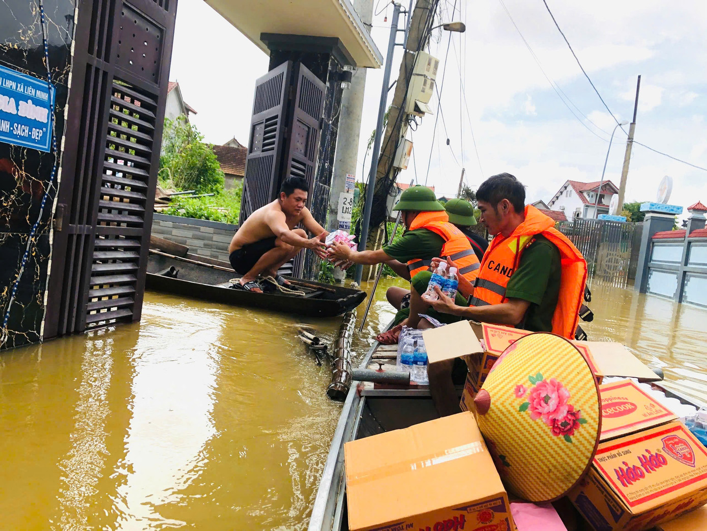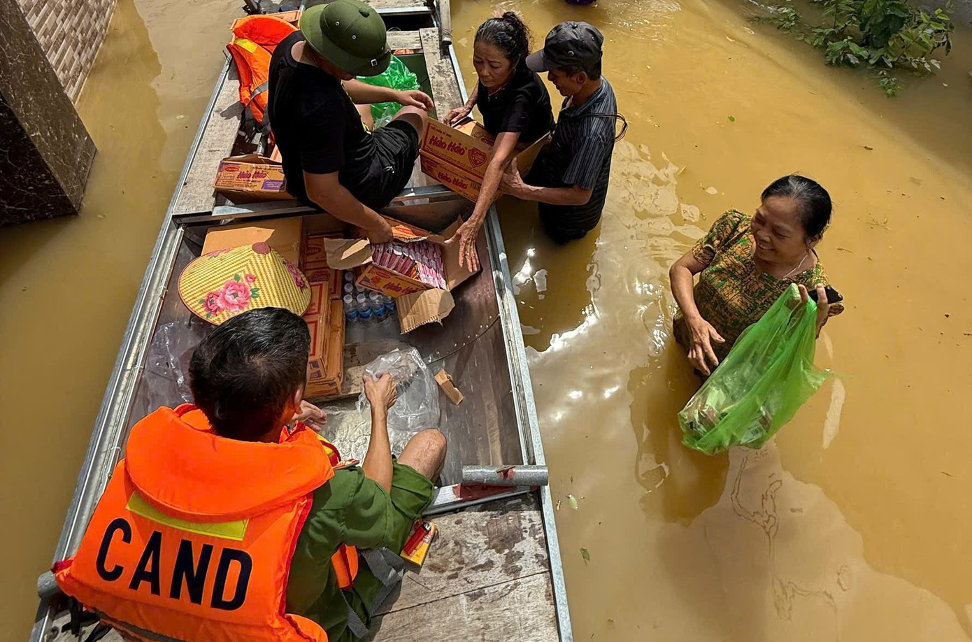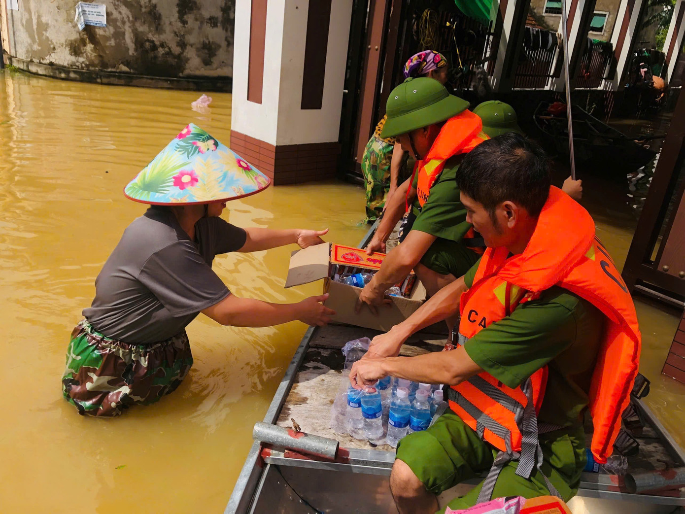 Công an Đức Minh đã tiếp tục chia thành nhiều nhóm chèo thuyền cung cấp lương thực, thực phẩm cho các hộ dân bị cô lập, góp phần đảm bảo an toàn và ổn định đời sống nhân dân.