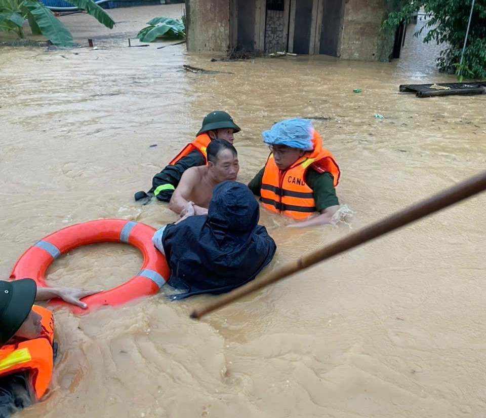 Công an xã Trại Cau (tỉnh Thái Nguyên) cứu 2 người dân bị mắc kẹt trong nhà bị ngập nước và đưa ra khu vực an toàn.
