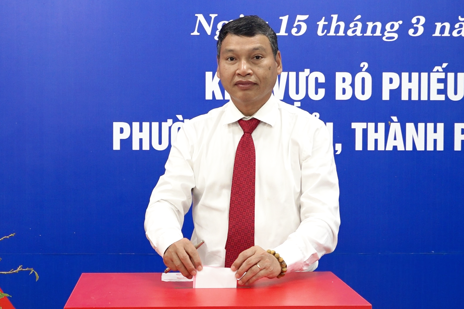 Phó Chủ tịch UBND thành phố Trần Nam Hưng bỏ phiếu tại tổ dân phố Hòa Nam, phường Bàn Thạch. Ảnh: THANH NHẤT