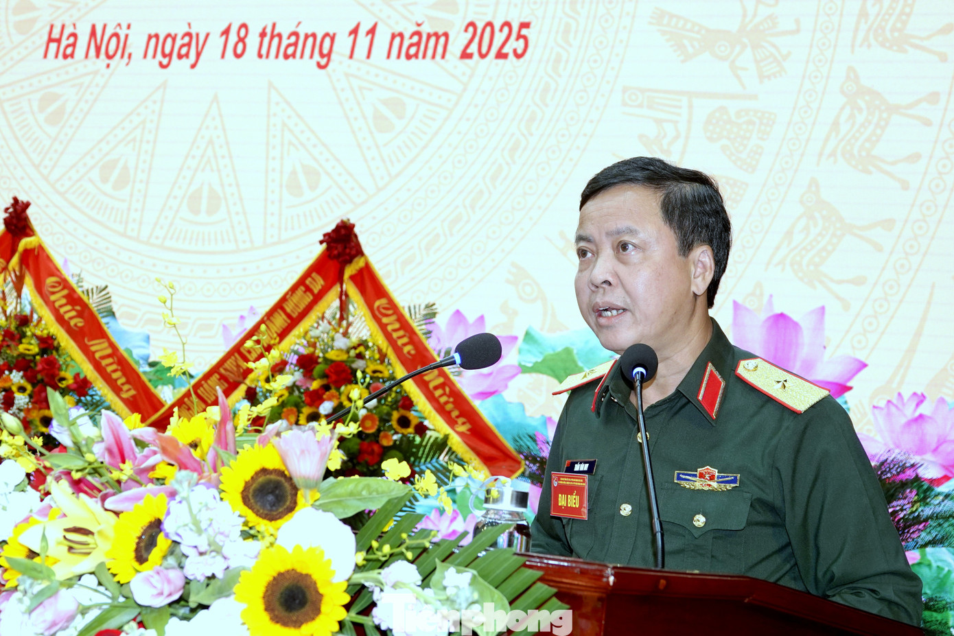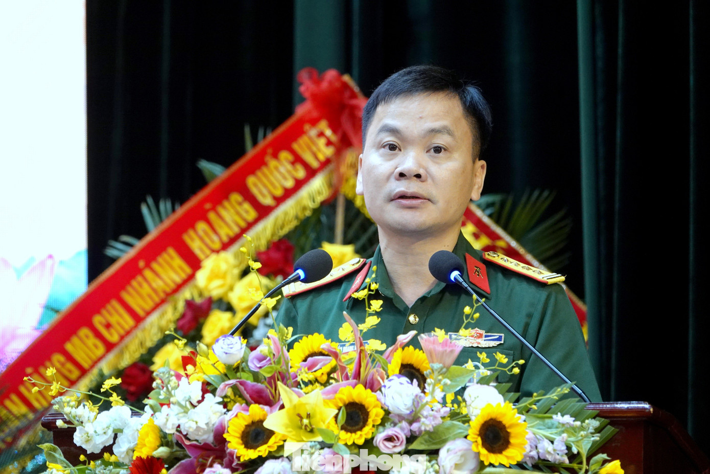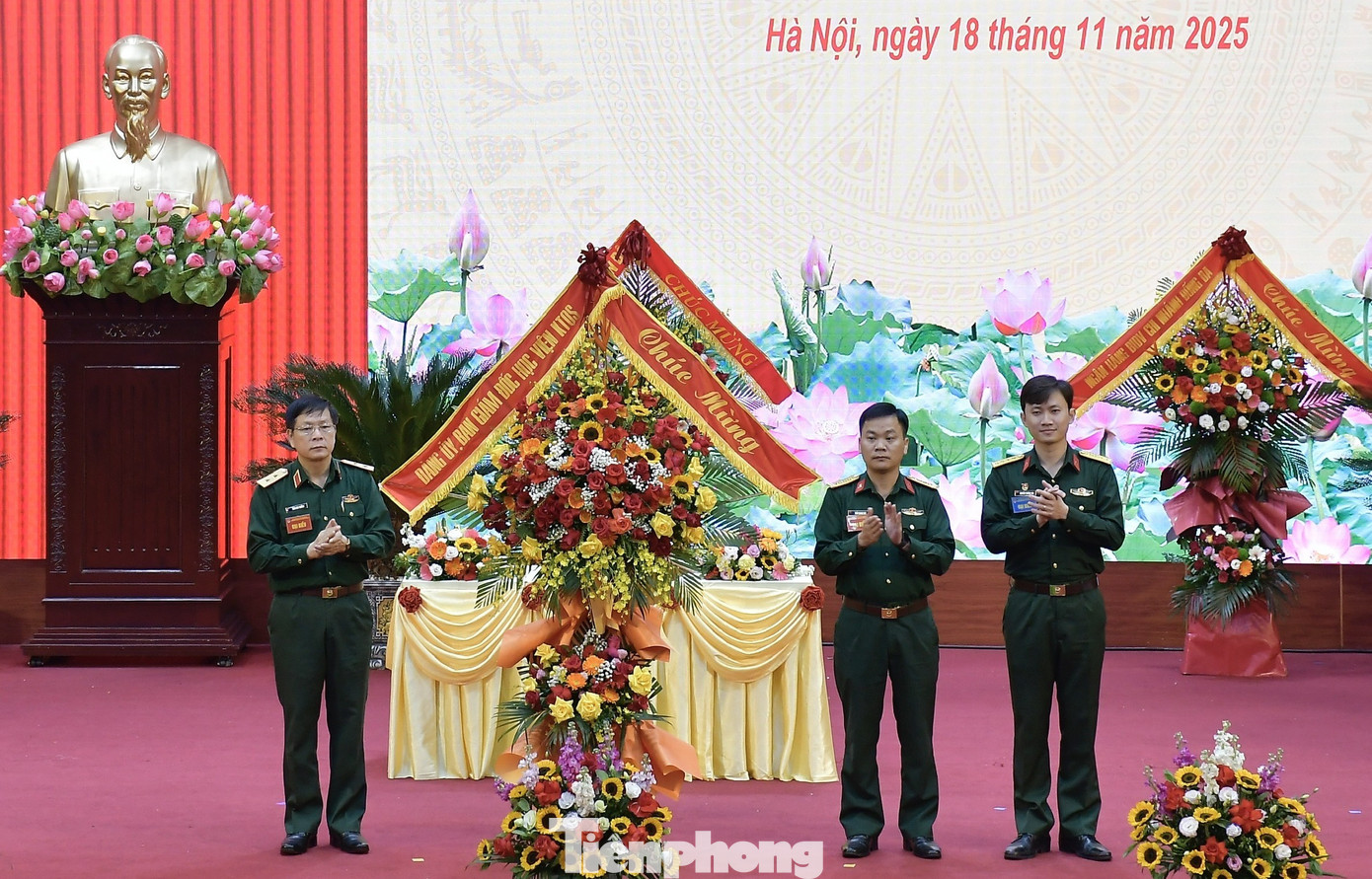 Trung tướng Trần Văn Thưởng - Bí thư Đảng ủy, Chính ủy Học viện Học viện Kỹ thuật Quân sự, tặng hoa chúc mừng hội nghị.