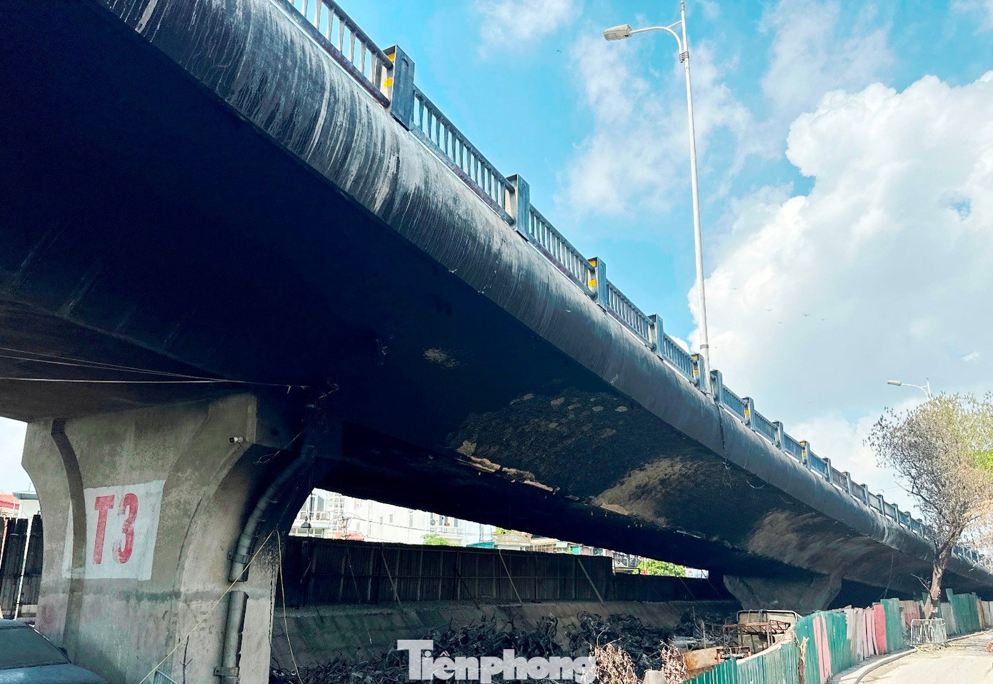 Gầm cầu Vĩnh Tuy hướng xuống đê Nguyễn Khoái bị cháy bãi xe vừa qua. Ảnh: AT
