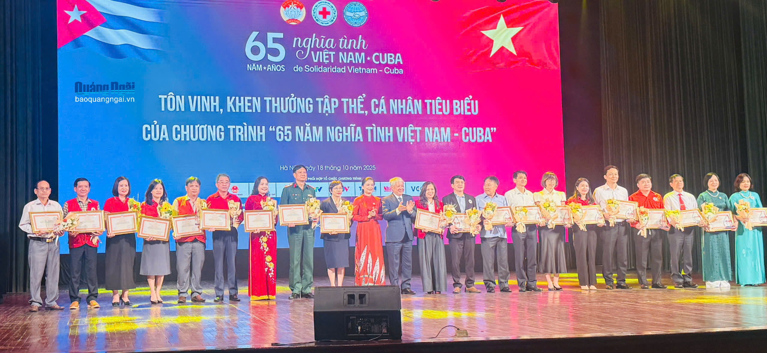 Trung ương Hội Chữ thập đỏ Việt Nam tặng Bằng khen các tập thể, cá nhân tiêu biểu thực hiện Chương trình "65 năm Nghĩa tình Việt Nam - Cuba, trong đó có Hội Chữ thập đỏ tỉnh Quảng Ngãi (thứ hai bên trái). ẢNH: ĐVCC
