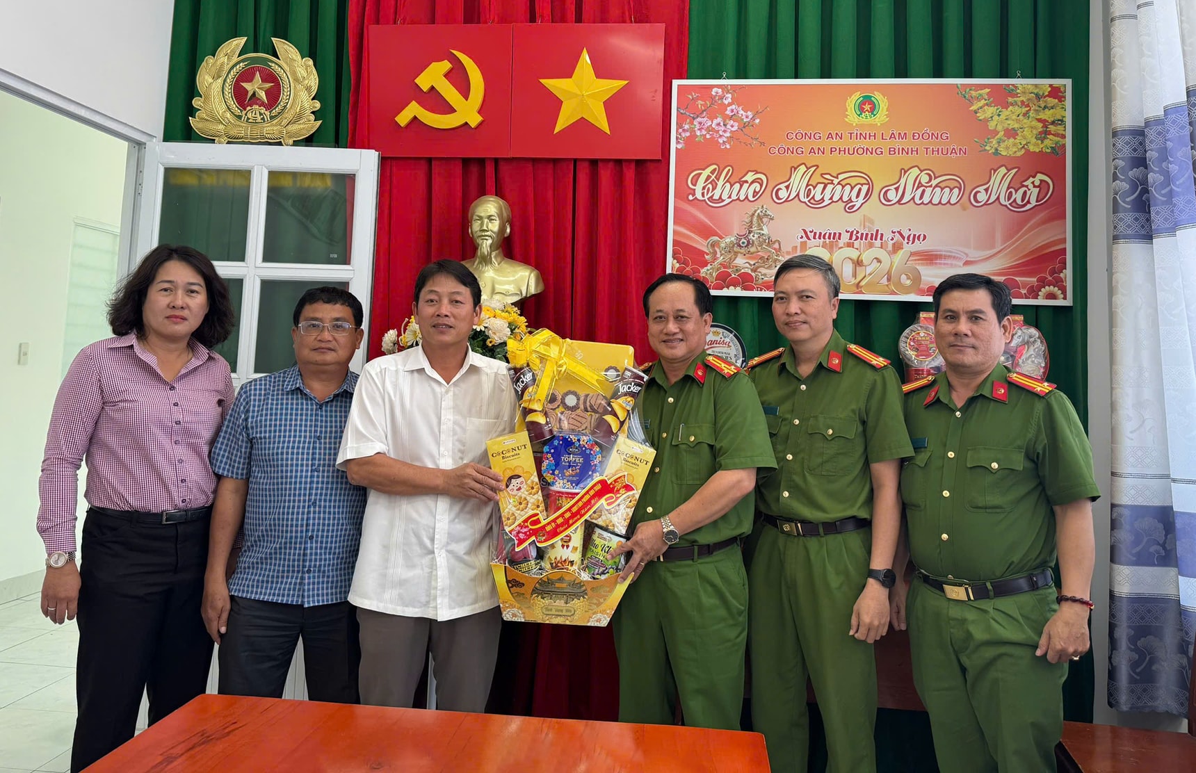 Ông Nguyễn Hồng Pháp (thứ 3 từ trái qua) - Ủy viên Ban Thường vụ Tỉnh ủy, Bí thư Đảng ủy, Chủ tịch HĐND phường Bình Thuận dẫn đầu đoàn công tác thăm, chúc Tết tại Công an phường
