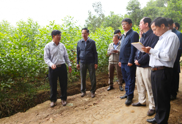 Phó Chủ tịch UBND tỉnh Đắk Lắk Nguyễn Thiên Văn (ngoài cùng bên trái) cùng lãnh đạo các sở, ngành liên quan đến khảo sát khu đât dự định xây dựng khu tái định canh, định cư cho các hộ dân sinh sống trong vùng nguy cơ bị sạt lở ở xã Yang Mao.