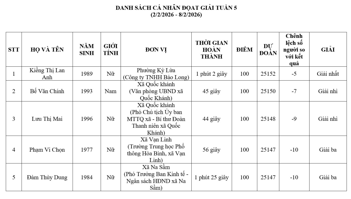 Dựa trên kết quả thi, Ban Tổ chức đã thông báo danh sách các thí sinh đoạt giải tuần thứ năm, gồm 1 giải nhất, 2 giải nhì, 3 giải ba và 5 giải khuyến khích. Trong đó, thí sinh Kiềng Thị Lan Anh, Công ty TNHH Bảo Long, phường Kỳ Lừa đã xuất sắc giành giải nhất.