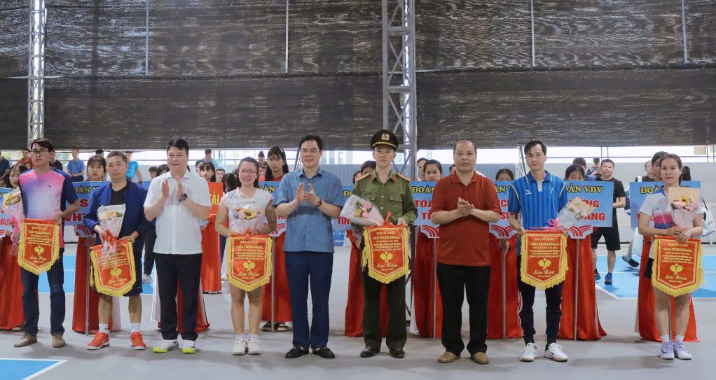 Đồng chí Vũ Hồng Quang, Phó Bí thư Tỉnh ủy, Chủ tịch Ủy ban Mặt trận Tổ quốc tỉnh và Ban Tổ chức trao cờ lưu niệm cho các đoàn vận động viên tham dự giải.