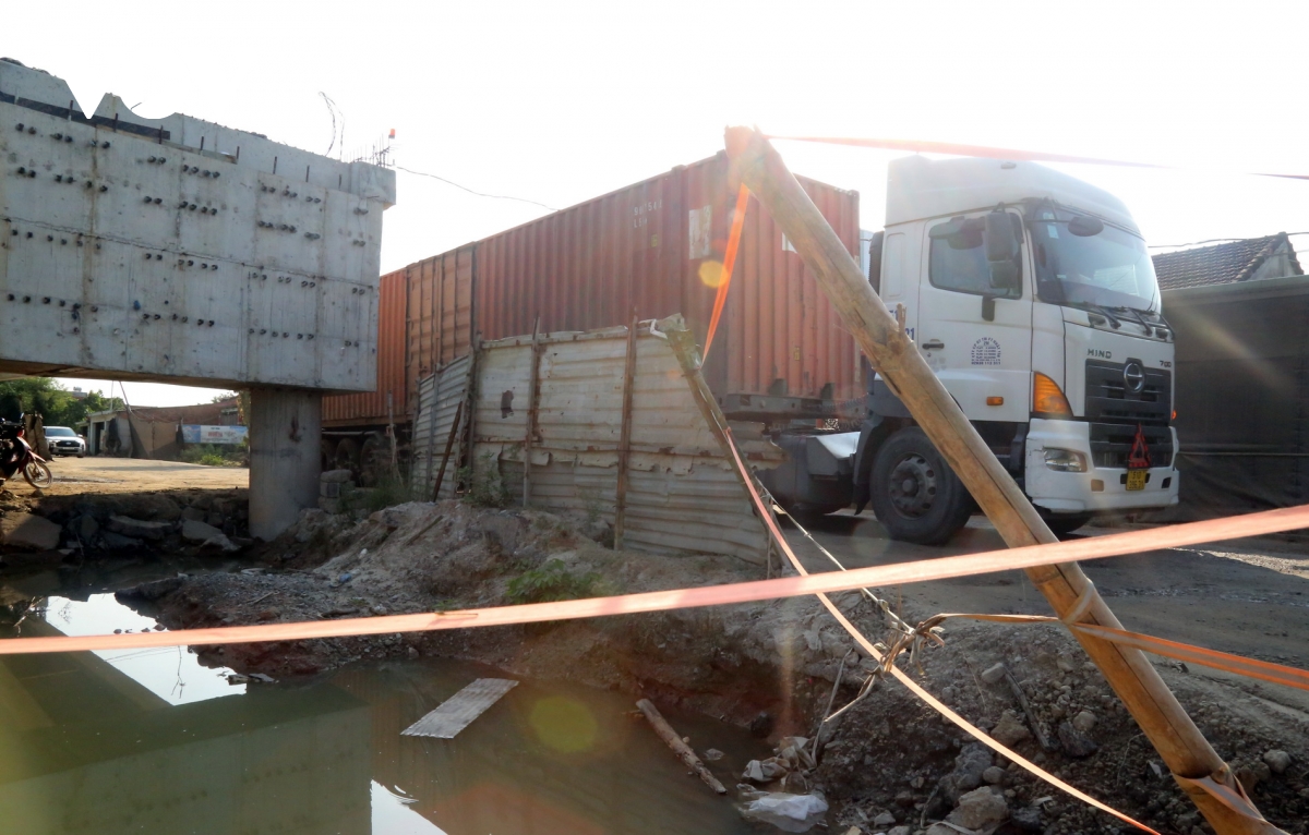 Cầu vượt đường sắt Bắc-Nam thuộc Dự án cải tạo, nâng cấp Quốc lộ 14E thi công dở dang. Phương tiện đi dưới cầu vượt chen chúc lưu thông, tiềm ẩn nguy cơ tai nạn.