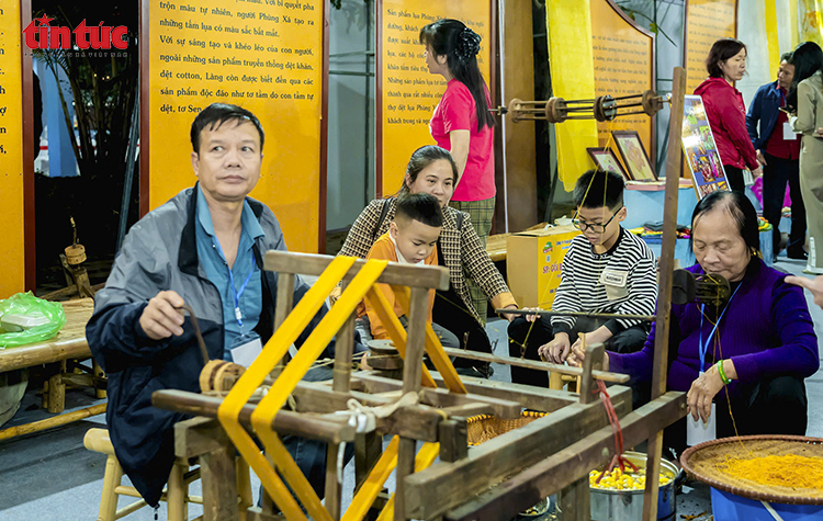 Du khách trải nghiệm các công đoạn dệt lụa truyền thống tại không gian làng nghề.