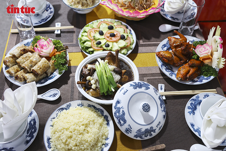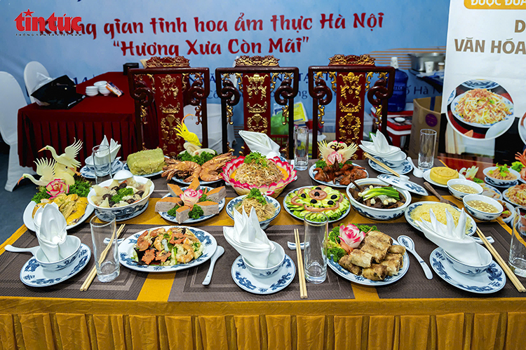 Những món ăn đặc trưng trong mâm cỗ truyền thống Hà Nội được bài trí công phu, thu hút sự quan tâm của đông đảo khách tham quan.