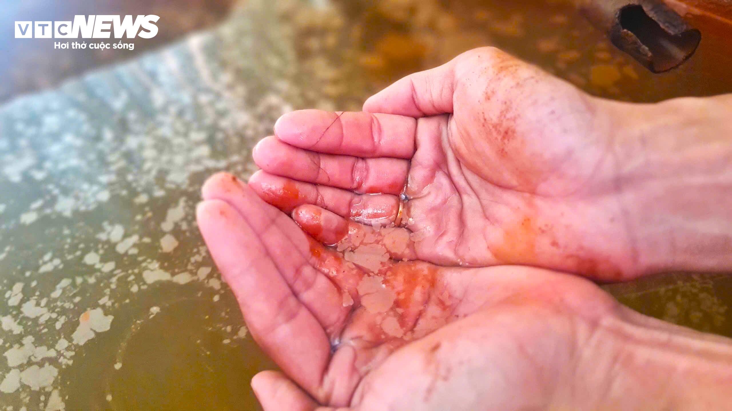 Vừa nói, bà Biến chỉ vào 2 thùng nước đang đặt ngoài sân vừa múc lên từ giếng nhà mình. Dưới ánh mặt trời gay gắt, lớp phèn trên mặt thùng nổi lềnh bềnh và đóng ván như dầu khiến bà không biết làm sao. "Nước này mà rửa rau hay tưới rau mình cũng lo. Vì nó ngấm dần, ngấm dần mình ăn vô thì cũng độc", bà Biến chia sẻ.