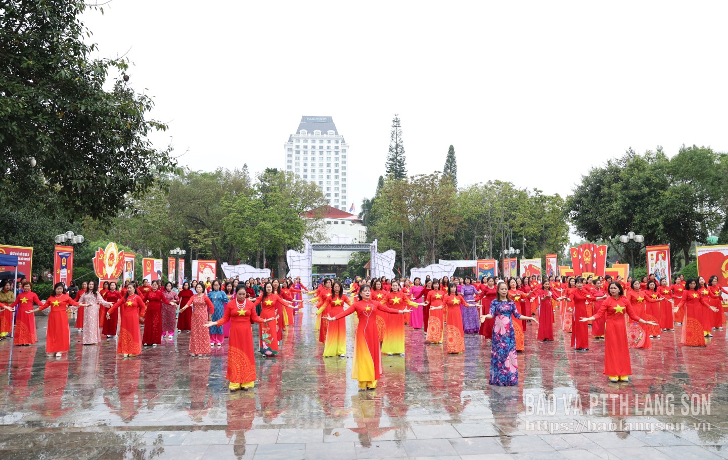 Điểm nhấn của chương trình là màn đồng diễn dân vũ với sự tham gia của hơn 300 hội viên phụ nữ trong trang phục áo dài truyền thống.