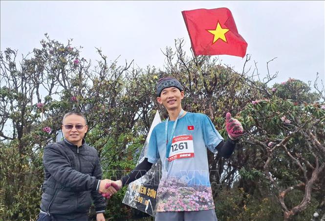 Chủ tịch UBND xã Sin Suối Hồ Nguyễn Mạnh Cường, Phó trưởng Ban tổ chức giải chúc mừng và trao huy chương cho các vận động viên khi lên tới đỉnh Tả Liên Sơn.