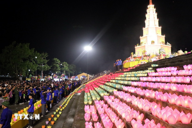 Thắp sáng hoa đăng tại lễ cầu an và hội hoa đăng. (Ảnh: Mạnh Tú/TTXVN)