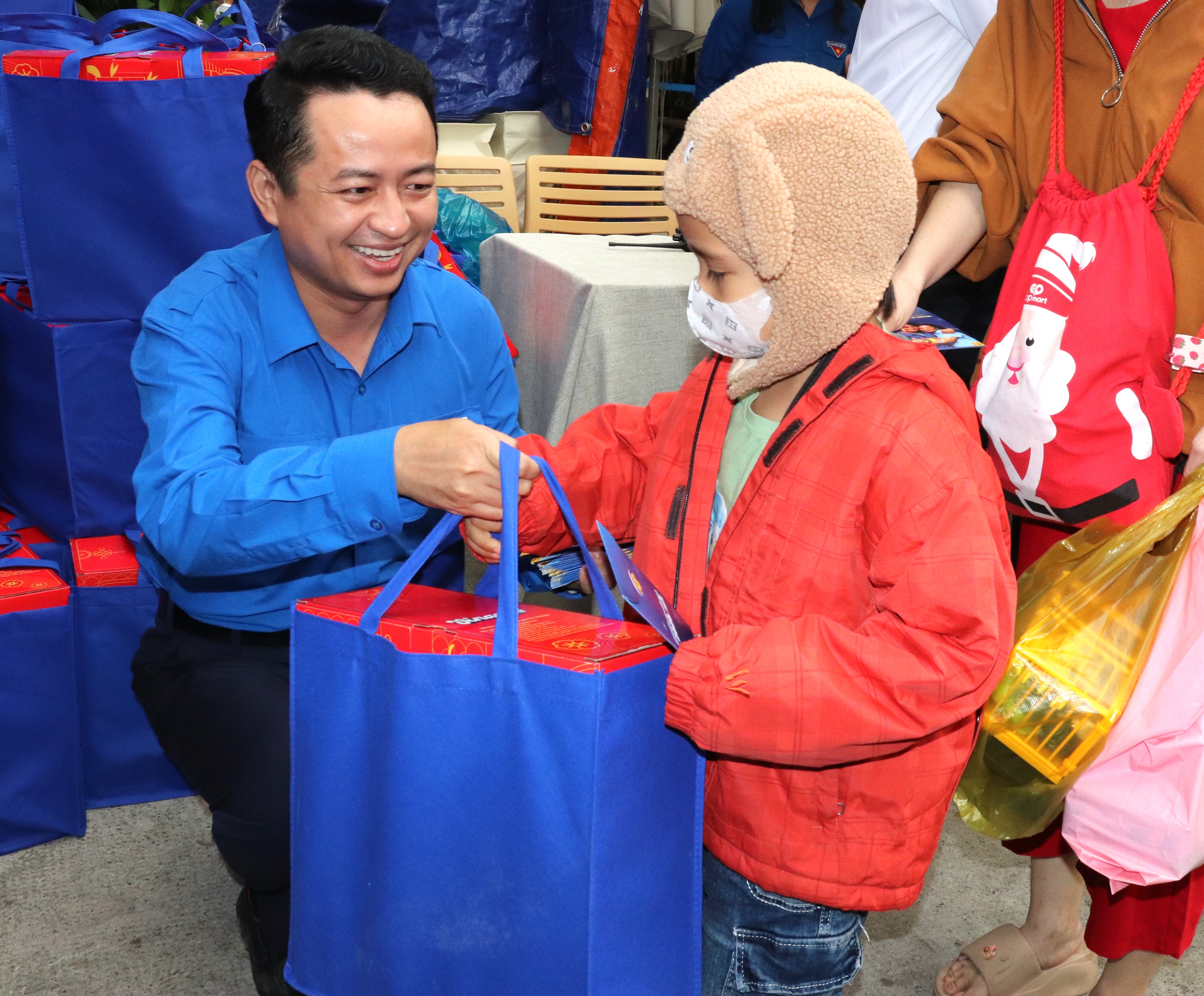 Trao quà đến con công nhân tham gia về quê sáng 11-2. Ảnh: THÁI PHƯƠNG