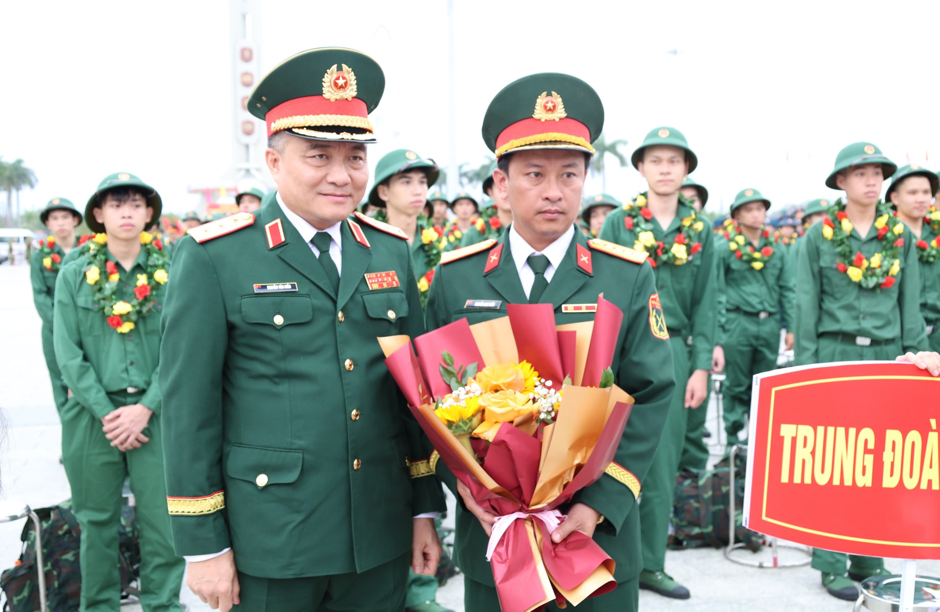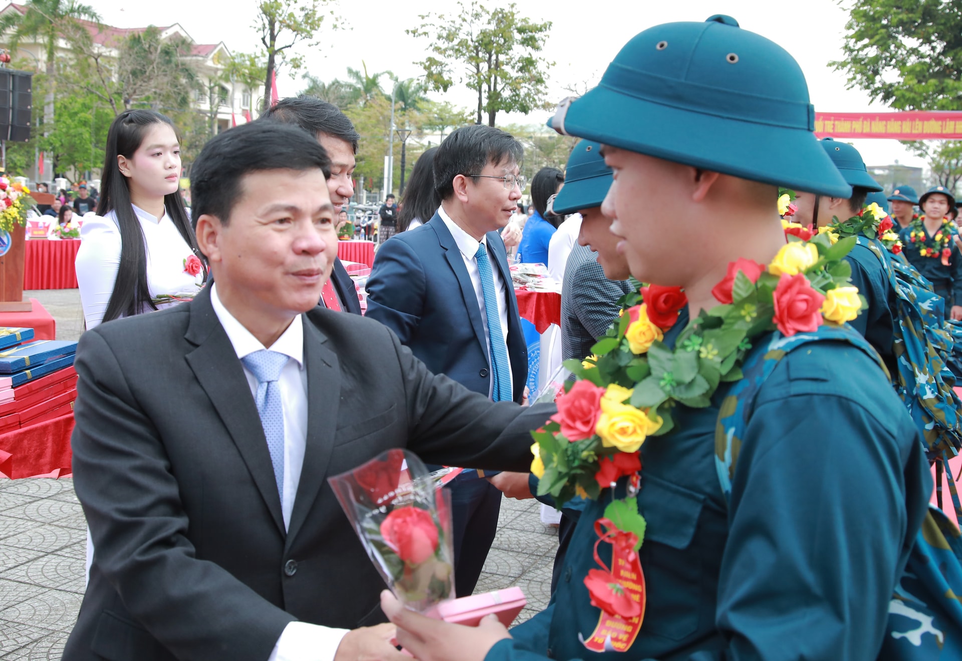 Phó Chủ tịch UBND thành phố Trần Nam Hưng tặng hoa động viên tân binh. Ảnh: TRUNG HIẾU