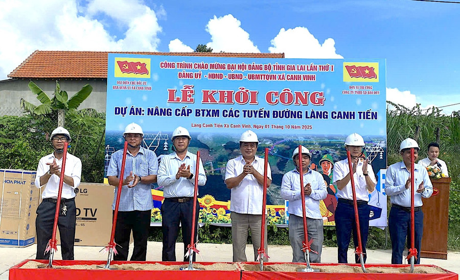 Các đại biểu thực hiện nghi thức động thổ khởi công công trình nâng cấp đường làng Canh Tiến. Ảnh: X.Đ