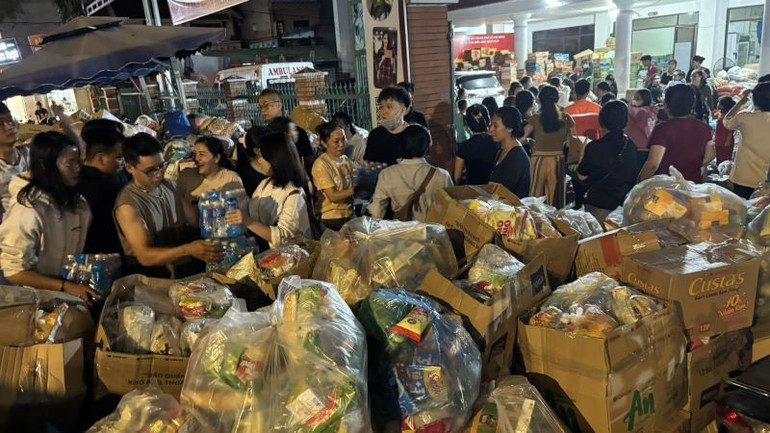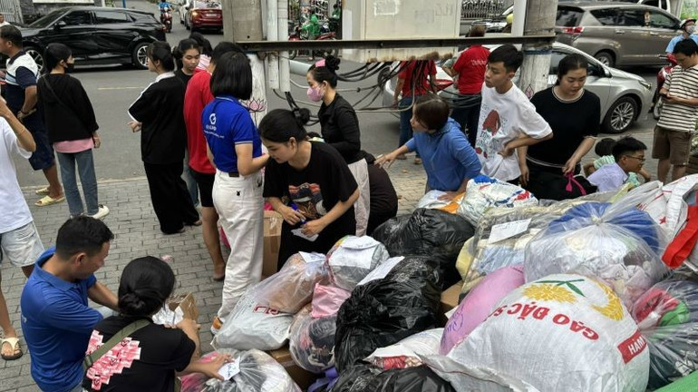Tình nguyện viên tham gia phân loại và đóng gói hàng hóa để vận chuyển hỗ trợ đồng bào bị ảnh hưởng do bão lũ.