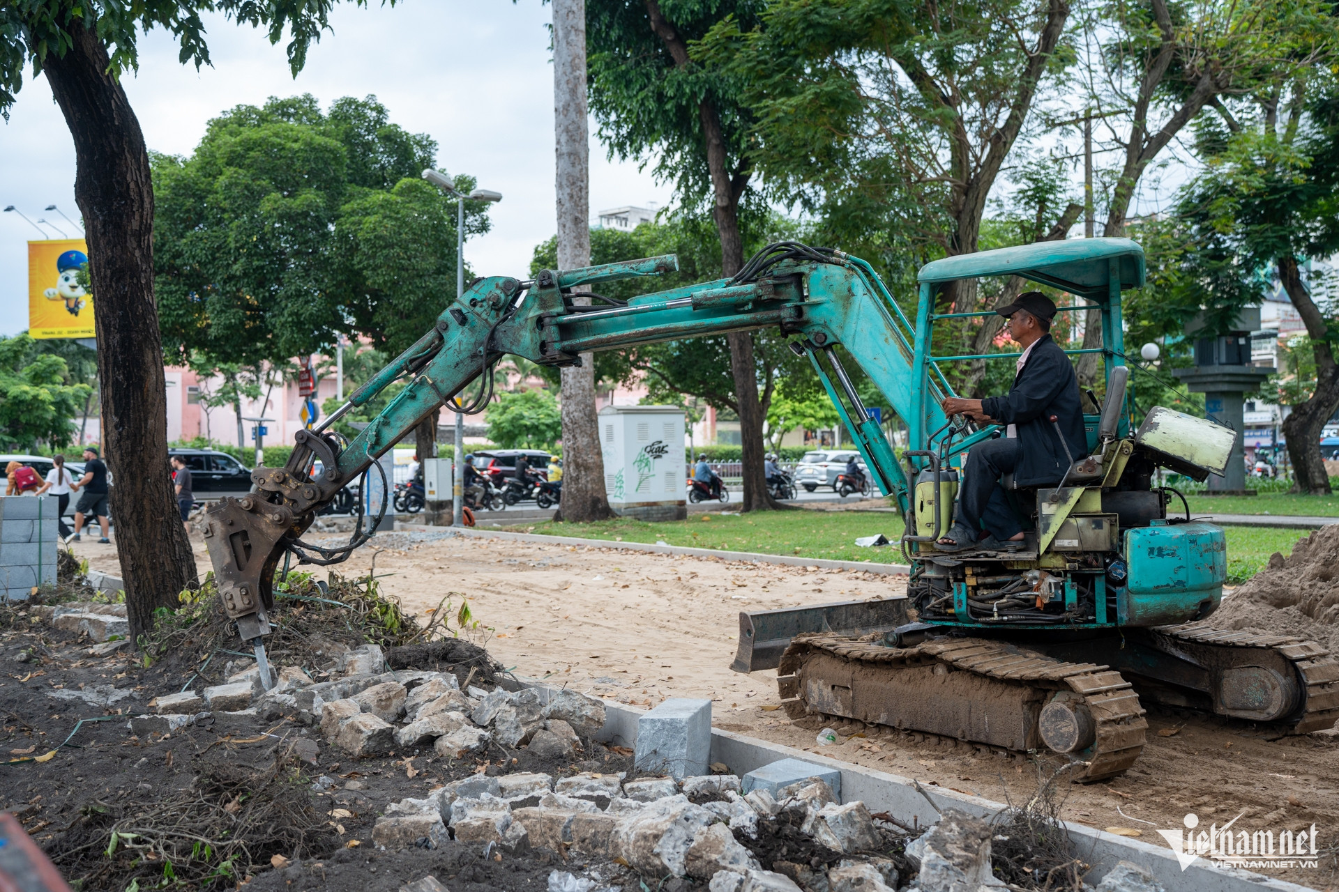 Tại công trường, máy móc cơ giới được huy động để bóc tách lớp vỉa hè cũ. Máy đào gắn búa thủy lực liên tục phá dỡ lớp đá và bê tông xuống cấp, tạo độ rung lớn để tách từng mảng vật liệu.