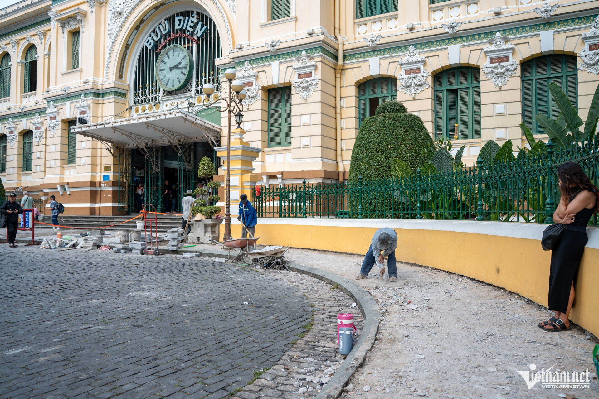 Trong khi đó, trên đường Phạm Ngũ Lão, khoảng 300m vỉa hè đoạn hướng về ga Metro Bến Thành đang được gấp rút lát lại.