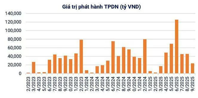 Hiệp hôịthị trường trái phiếu Việt Nam (VBMA) vừa có báo cáo thị trường trái phiêútháng 9/2025. Theo dữ liệu VBMA tổng hợp từ HNX và SSC (dữ liệu ghi nhận theongày phát hành trái phiếu và ngày thực hiện mua lại từ chuyên trang của HNX; cóthể được thay đổi theo việc công bố thông tin trên chuyên trang của HNX), tínhđến ngày công bố thông tin 30/9/2025, có 26 đợt phát hành trái phiếu riêng lẻtrị giá 23.204 tỷ đồng và 1 đợt phát hành ra công chúng trị giá 499 tỷ đồngtrong tháng 9/2025.