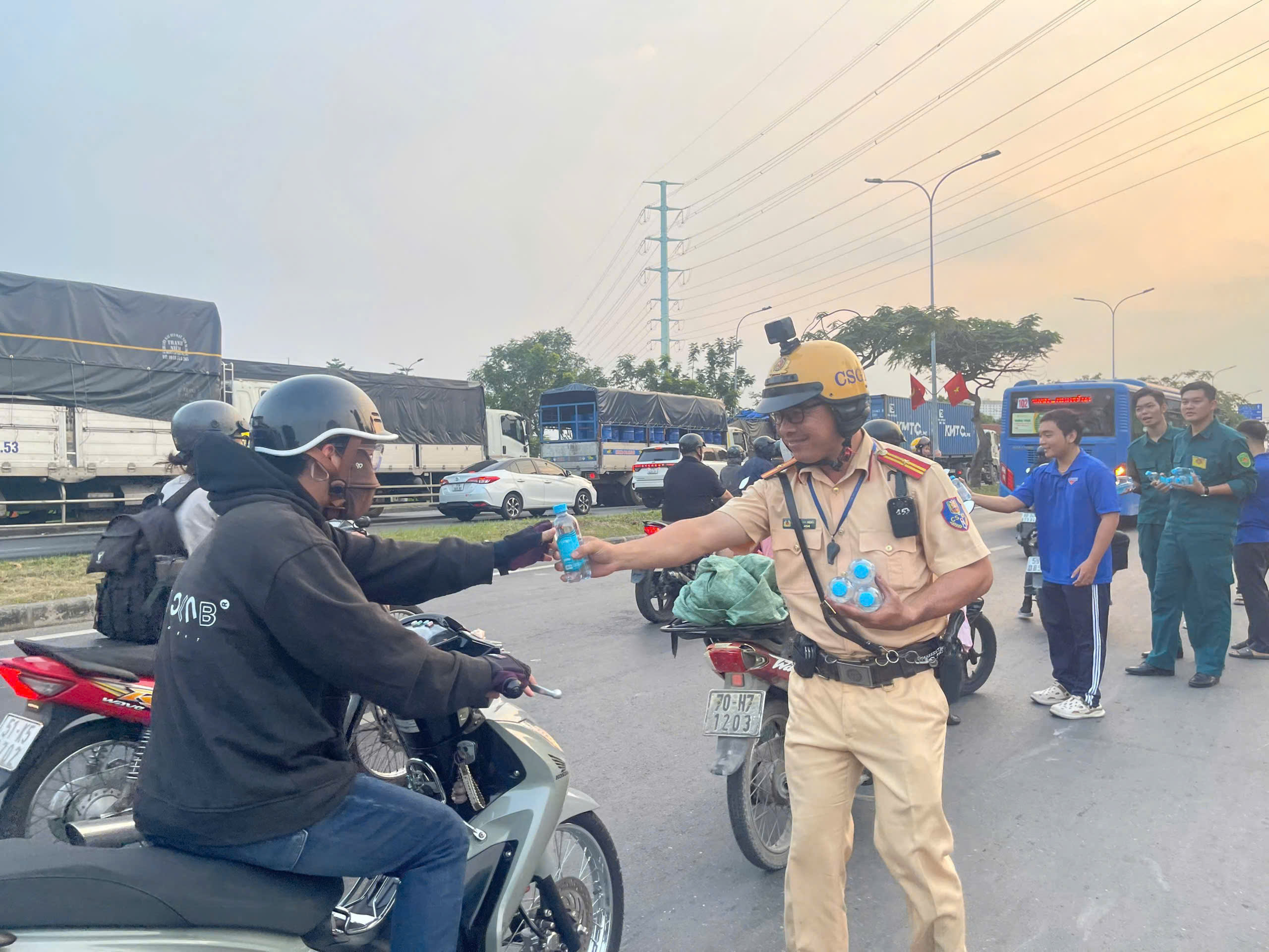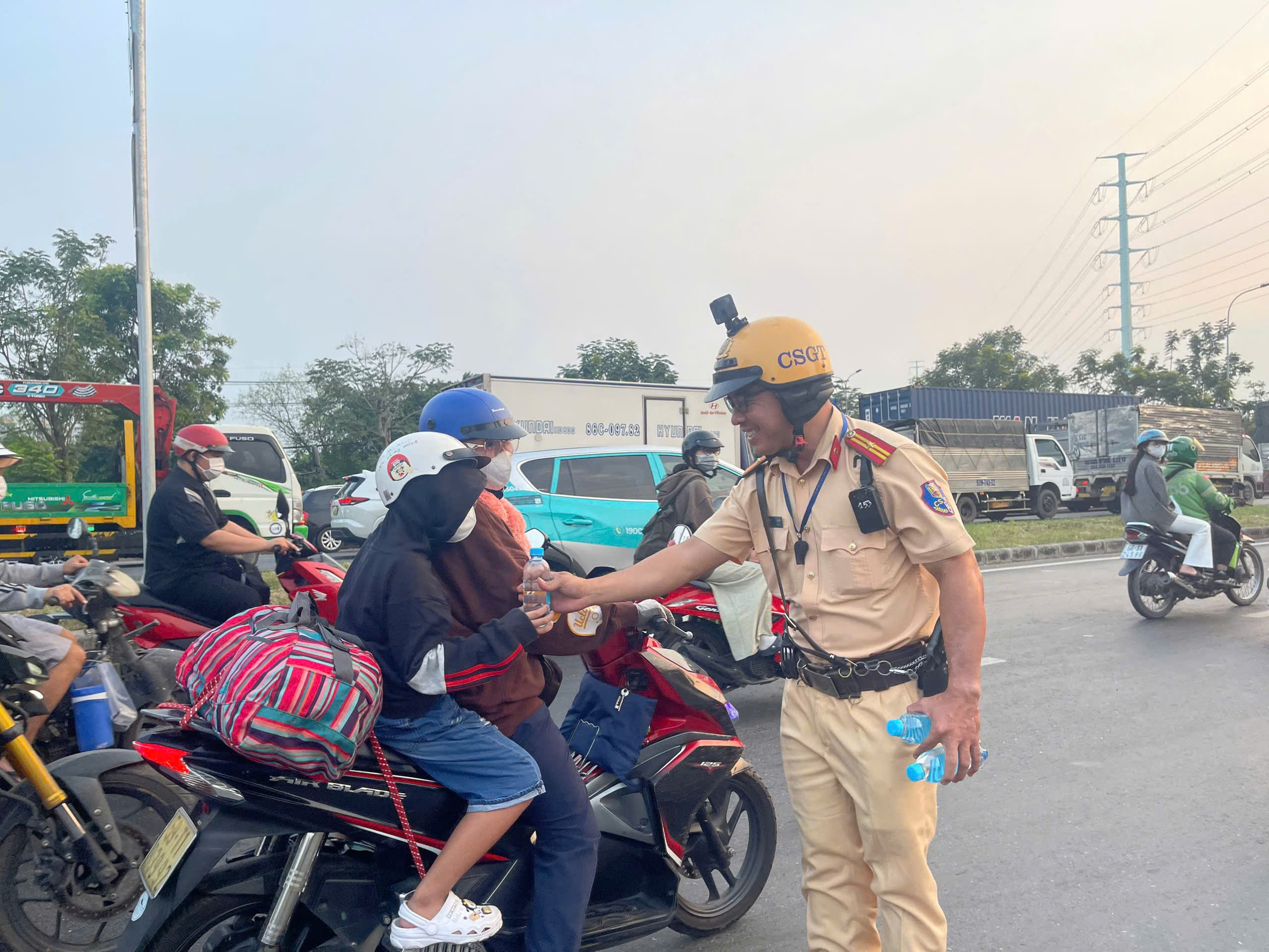 Lực lượng CSGT tiếp nước cho người dân về quê nghỉ lễ