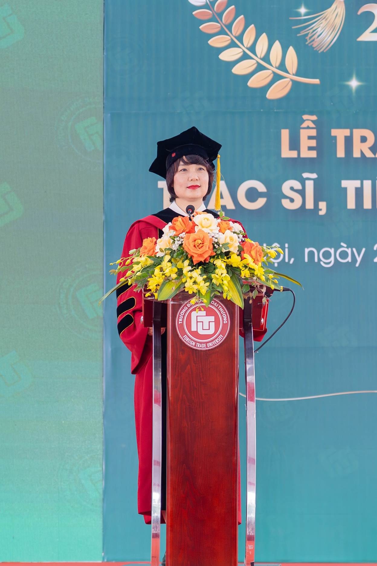 Phát biểu tại buổi lễ, PGS, TS Phạm Thu Hương – Hiệu trưởng Nhà trường – gửi lời chúc mừng tới các Tân thạc sĩ, Tân tiến sĩ, đồng thời vị hiệu trưởng bày tỏ: “Khoảnh khắc hôm nay không khép lại hành trình gắn bó giữa các bạn và Nhà trường mà là sự khởi đầu của sự gắn kết lâu dài hơn. Nhà trường mong muốn trở thành đối tác tri thức lâu dài của mỗi cựu học viên và nghiên cứu sinh trên con đường phát triển sự nghiệp và đóng góp cho xã hội thông qua các hoạt động học thuật, hội thảo chuyên đề, chương trình bồi dưỡng và cập nhật tri thức mới; các hoạt động kết nối doanh nghiệp, chính sách và nghiên cứu; cũng như những cơ hội hợp tác trong đào tạo, tư vấn và chuyển giao tri thức.