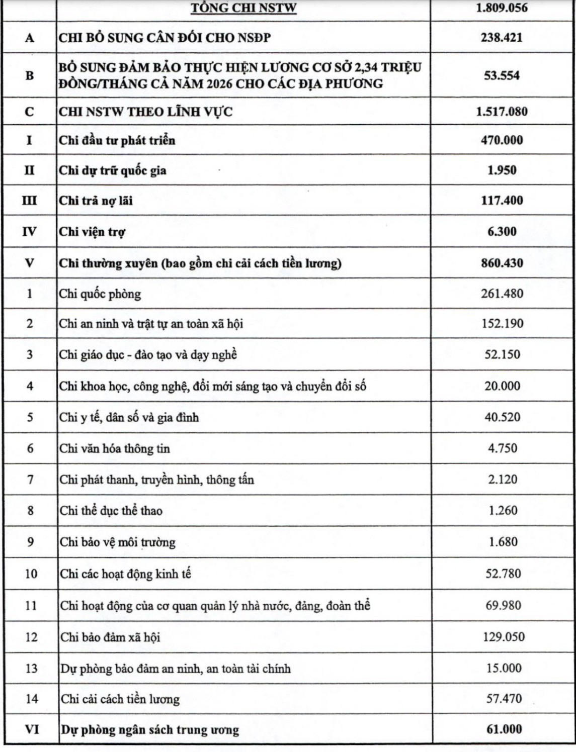 Nghị quyết được Quốc hội thông qua, xác định rõ việc đảm bảo nguồn lực cho chính sách cải cách tiền lương và các chế độ an sinh là một trong những ưu tiên hàng đầu trong phân bổ ngân sách năm 2026. Trong đó, tổng dự toán chi cải cách tiền lương là 57.470 tỷ đồng, nằm trong tổng chi thường xuyên 860.430 tỷ đồng. 53.554 tỷ đồng được bổ sung cho ngân sách các địa phương nhằm đảm bảo thực hiện mức lương cơ sở 2,34 triệu đồng/tháng trong cả năm 2026.
