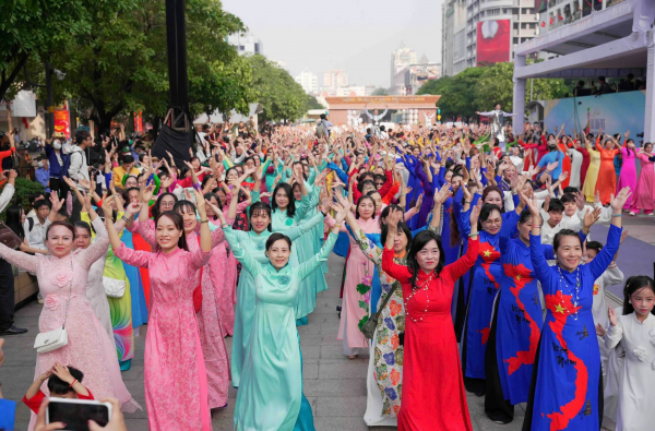 Đồng diễn áo dài tại phố đi bộ Nguyễn Huệ nhằm tôn vinh vẻ đẹp áo dài Việt Nam, lan tỏa niềm tự hào về truyền thống lịch sử, văn hóa dân tộc và chào mừng 50 năm thành phố mang tên Bác.