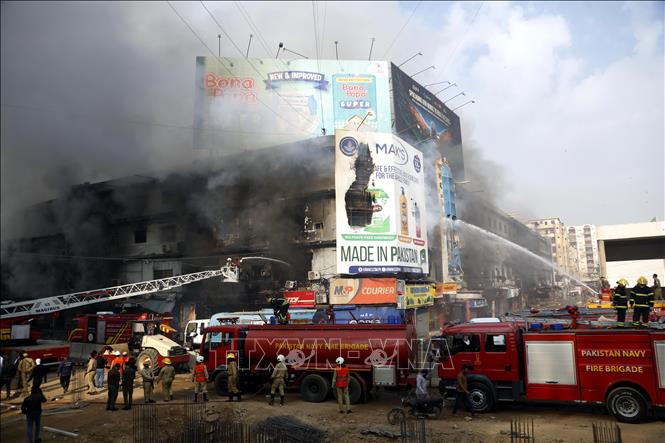 Lính cứu hỏa nỗ lực dập lửa tại hiện trường vụ cháy tòa nhà Trung tâm thương mại ở Karachi, Pakistan ngày 18/1/2026. Ảnh: THX/TTXVN