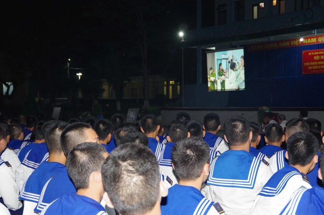 Các chiến sĩ mới chăm chú theo dõi phóng sự tuyên truyền về tác hại của ma túy.