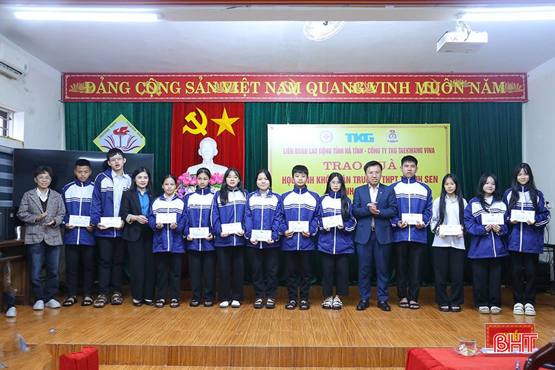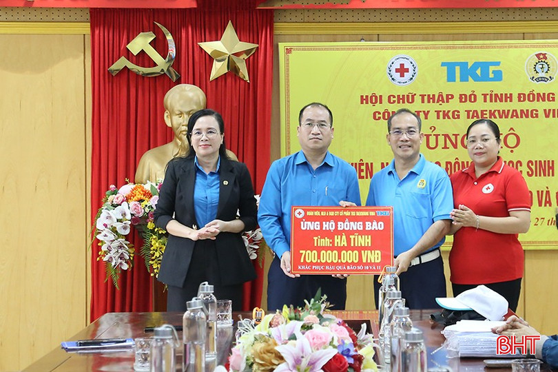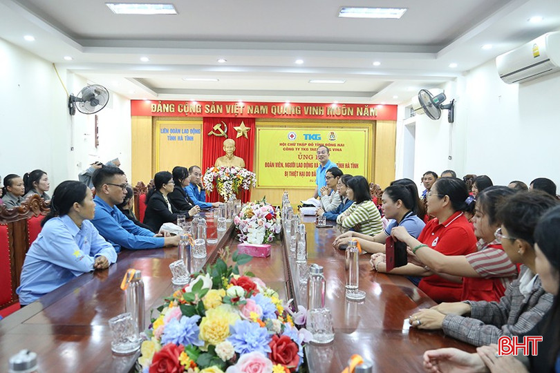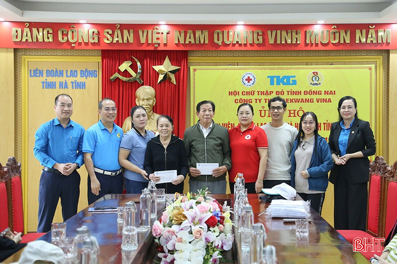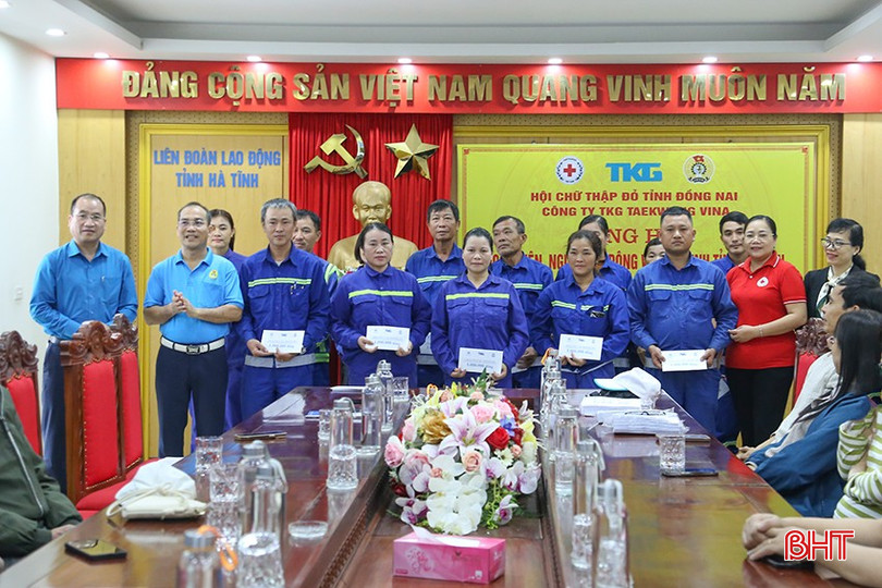 Trong khuôn khổ chương trình, đại diện Hội Chữ thập đỏ tỉnh Đồng Nai và Công ty cổ phần TKG TAEKWANG VINA đã trao biểu trưng số tiền 700 triệu đồng cho đại diện lãnh đạo Liên đoàn Lao động tỉnh Hà Tĩnh.