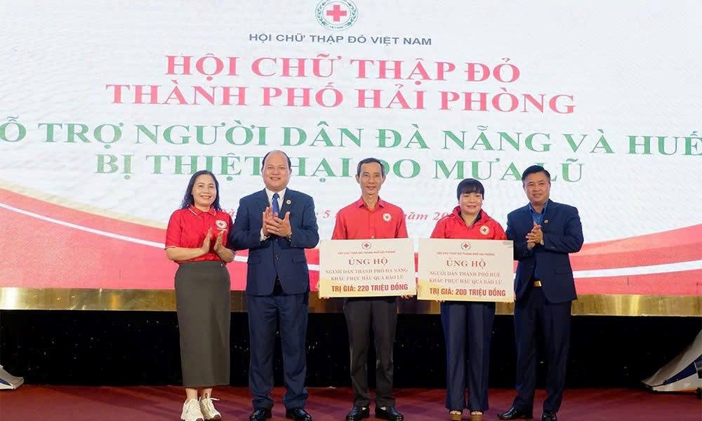 Hội Chữ thập đỏ TP. Hải Phòng trao tặng 220 triệu đồng cho Hội Chữ thập đỏ Đà Nẵng và 200 triệu đồng cho Hội Chữ thập đỏ Huế.