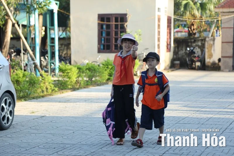 Học sinh Trường Tiểu học xã Hoằng Quý đi nhờ cổng của Trường THCS Hoằng Quý để đến trường.