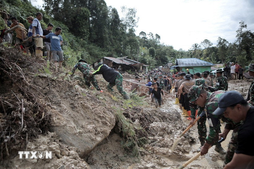 Lực lượng cứu hộ và người dân thu dọn bùn đất sau lũ lụt và lở đất tại Bắc Sumatra, Indonesia, ngày 28/11/2025. (Ảnh: THX/TTXVNc)