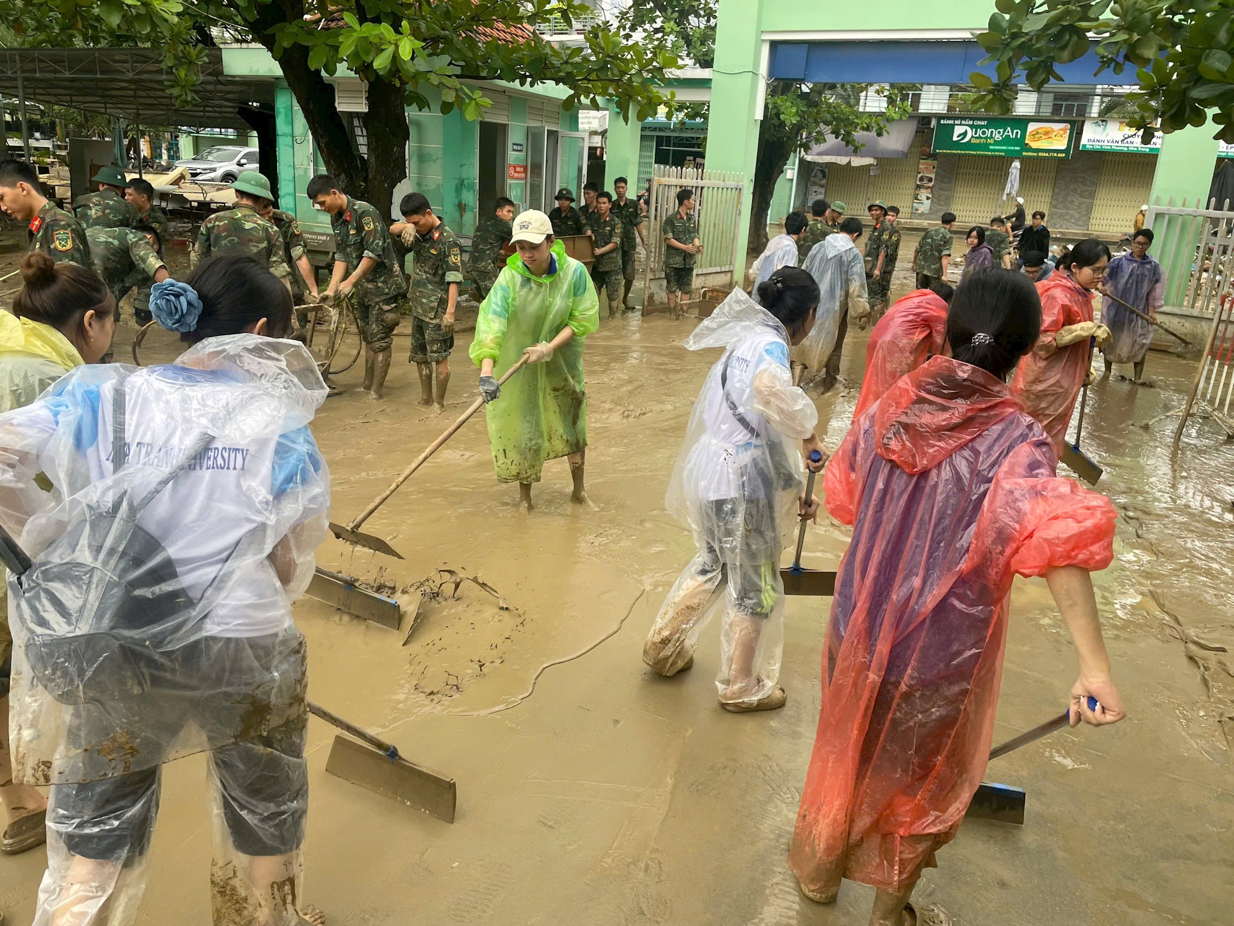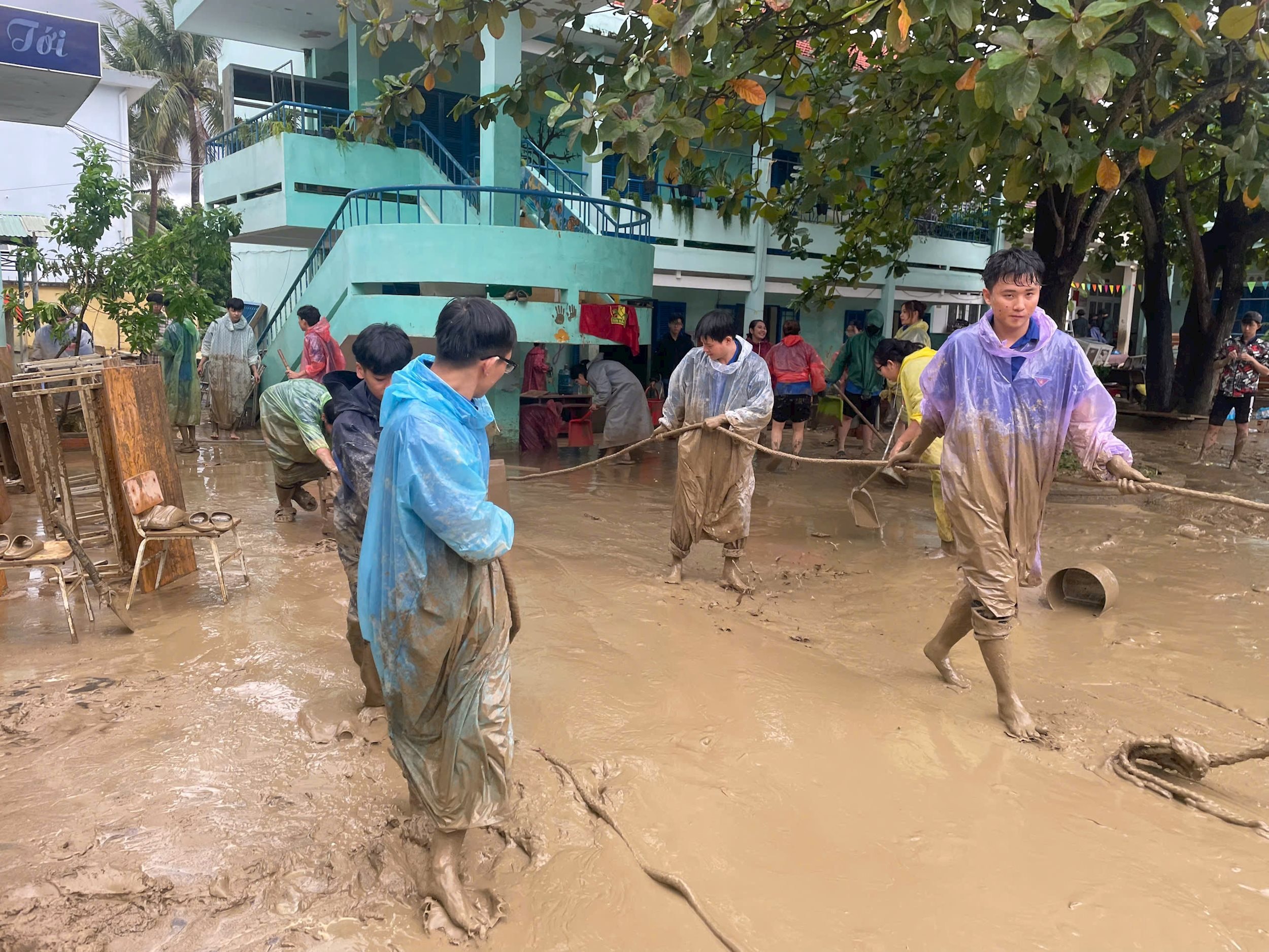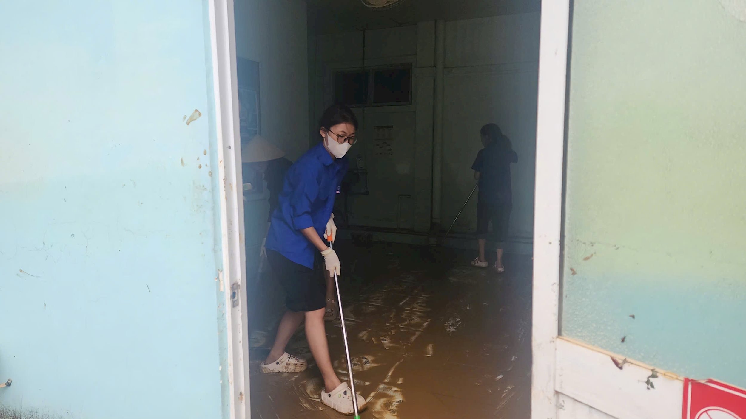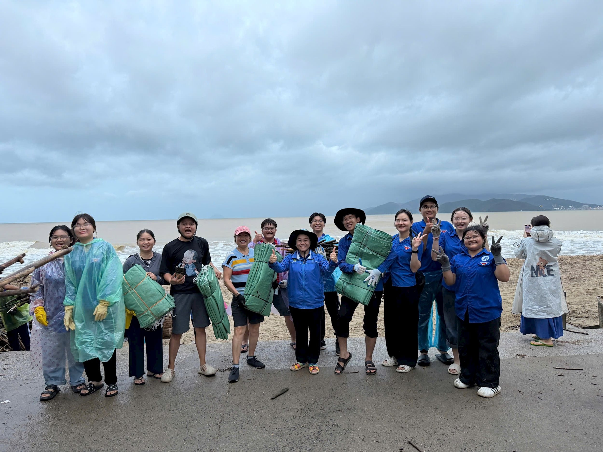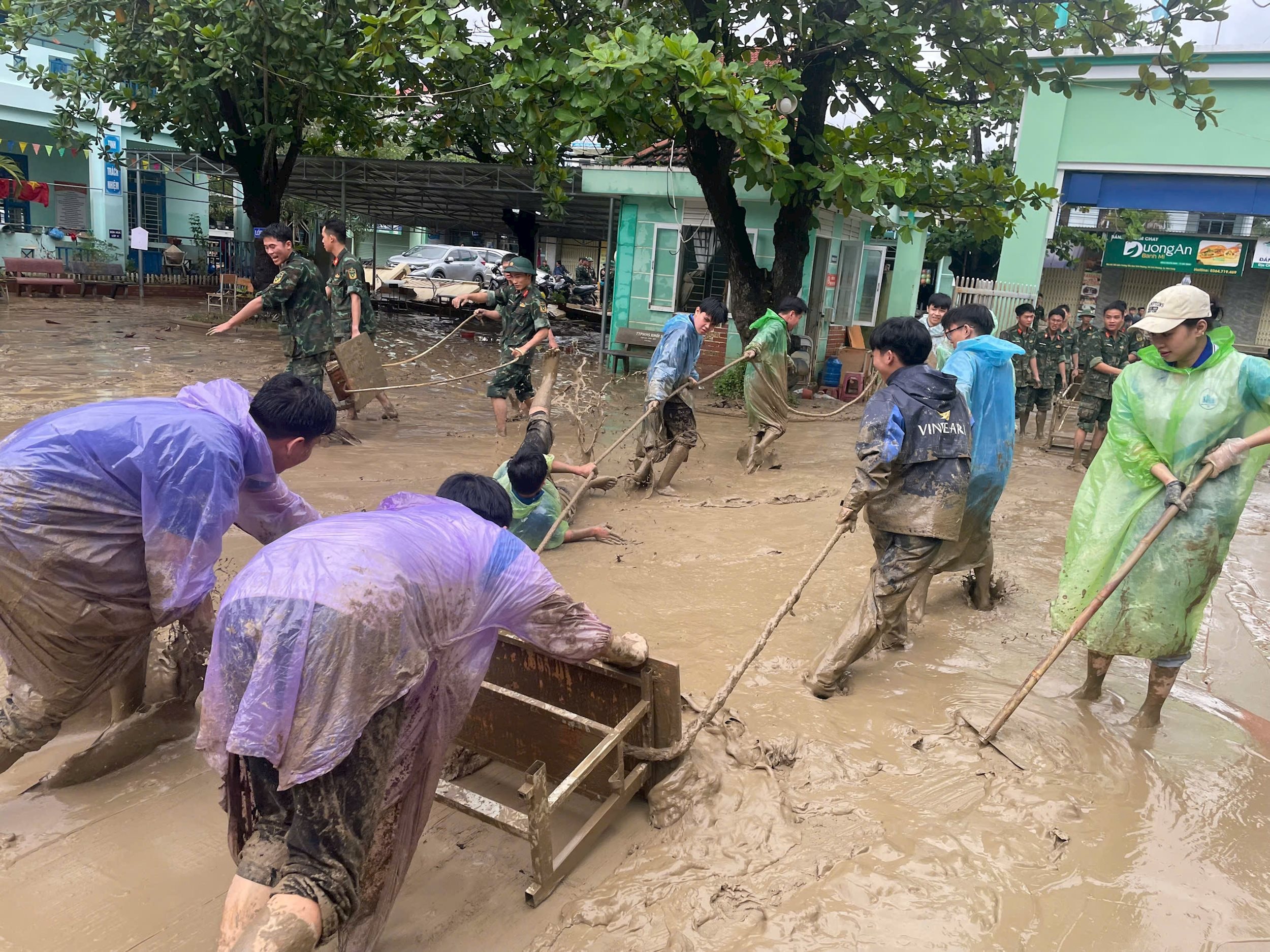 Những chiếc áo xanh, tay cầm xẻng, cuốc, chổi quét, cùng nhau dọn dẹp từng mét đường, khơi từng đoạn cống, dựng lại từng mái tôn bị gió xé, như thể họ đang lấp đi khoảng trống của thiên tai bằng chính trái tim và tinh thần xung kích của mình.