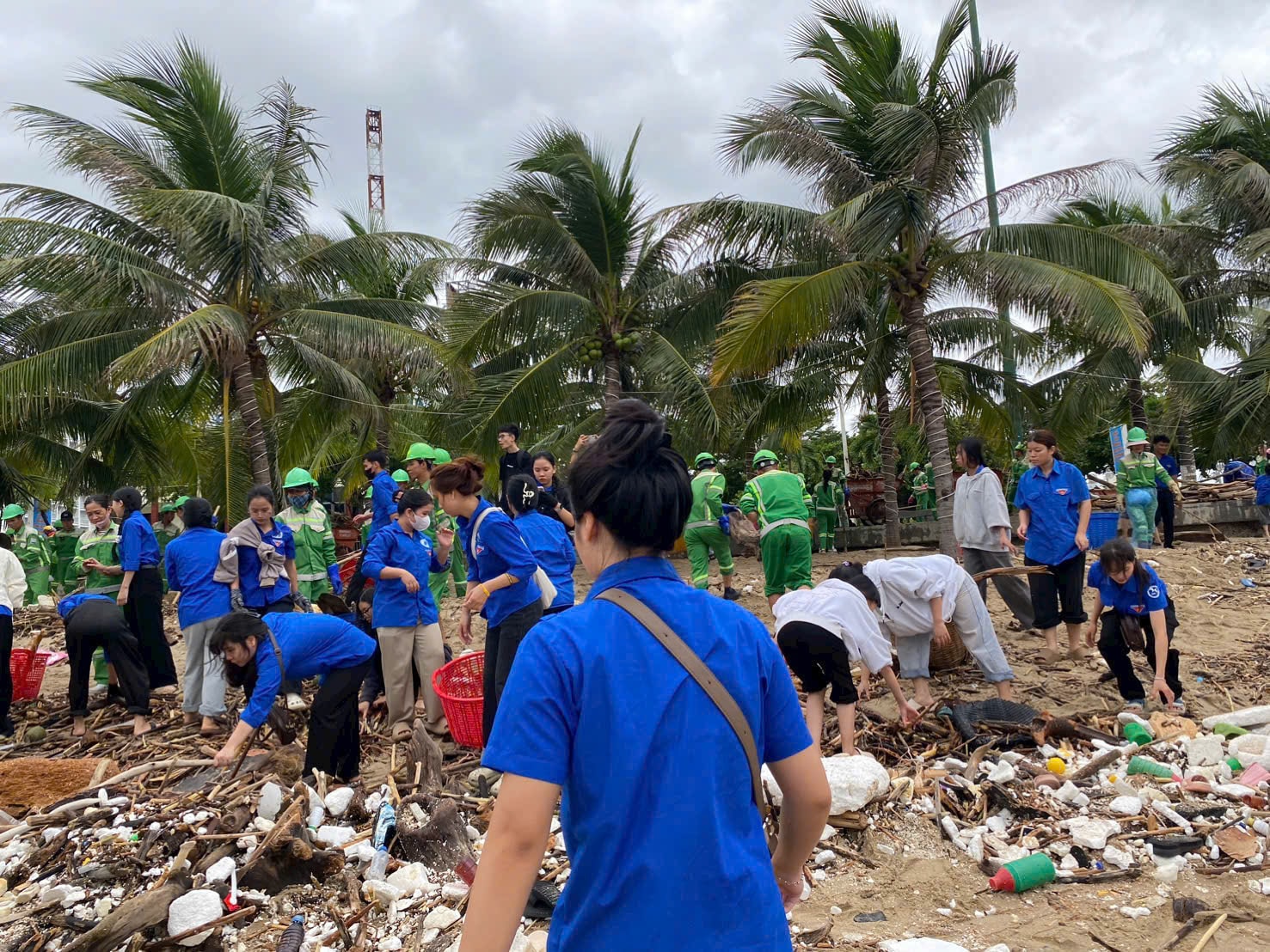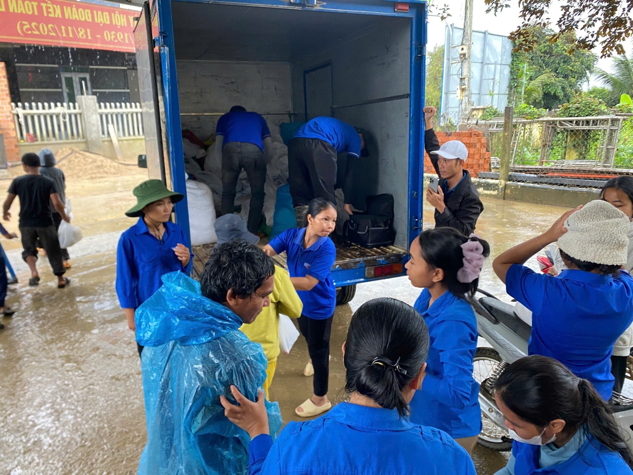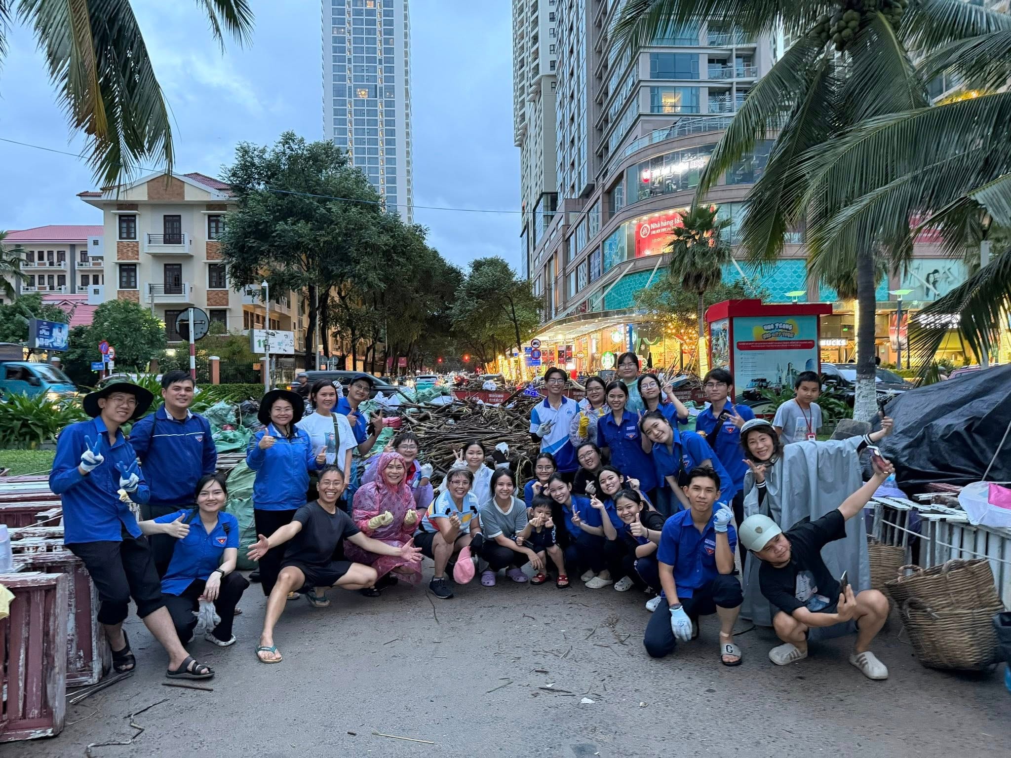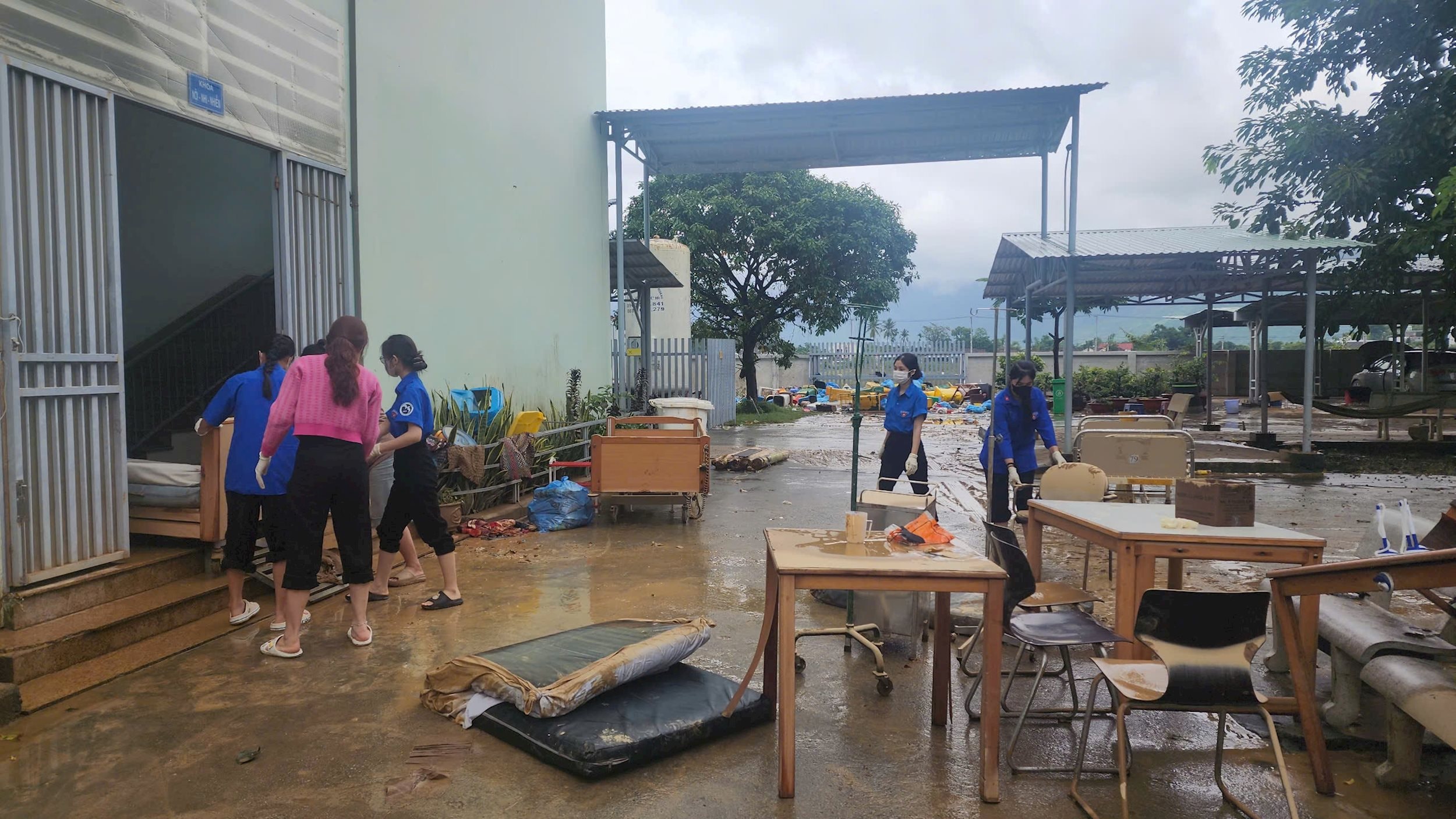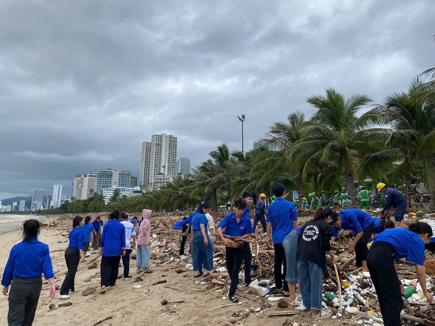 Những chiếc áo xanh, tay cầm xẻng, cuốc, chổi quét, cùng nhau dọn dẹp từng mét đường, khơi từng đoạn cống, dựng lại từng mái tôn bị gió xé, như thể họ đang lấp đi khoảng trống của thiên tai bằng chính trái tim và tinh thần xung kích của mình.
