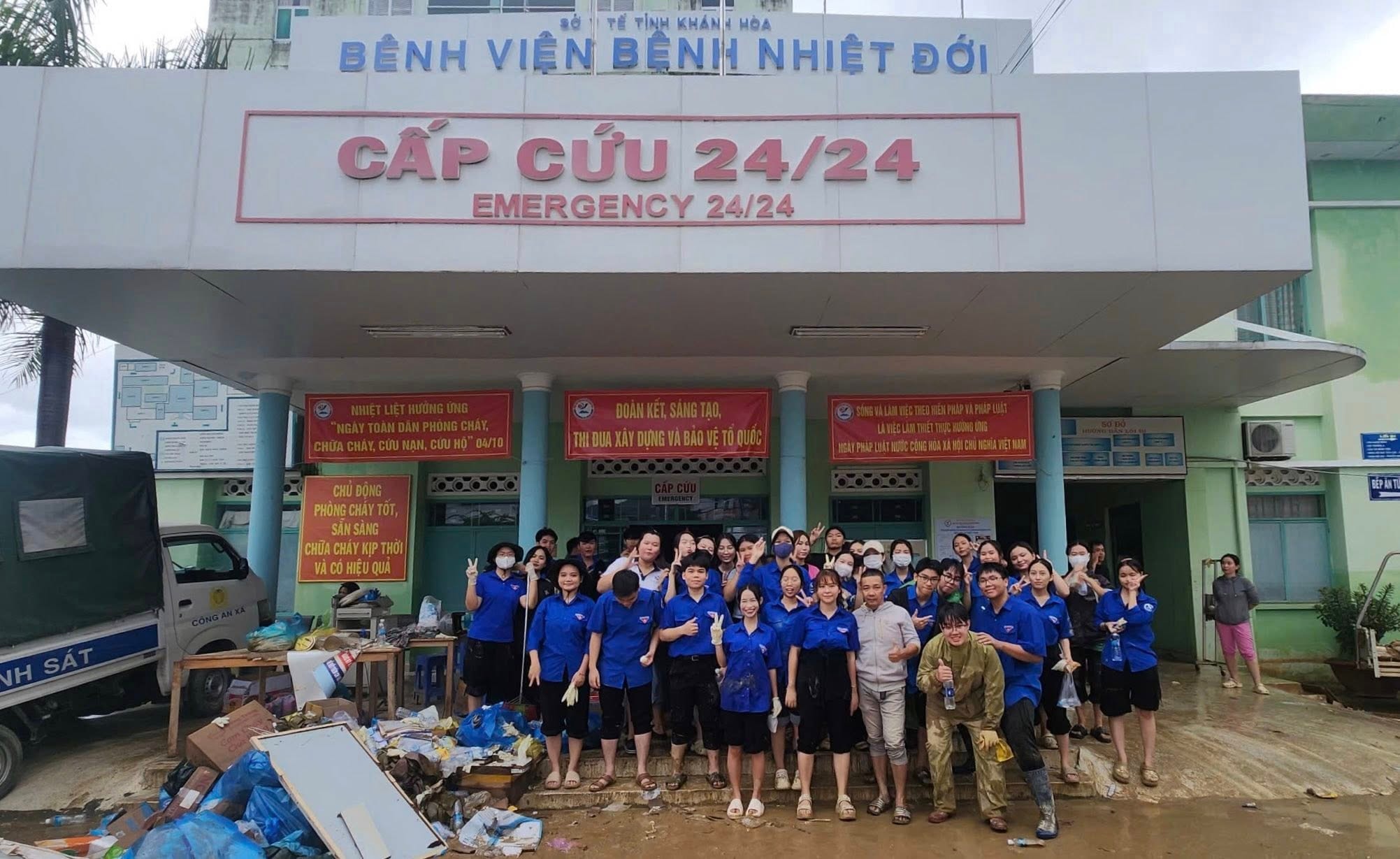 Dọn dẹp vệ sinh tại Bệnh viện Bệnh Nhiệt đới tỉnh Khánh Hòa để đảm bảo điều kiện công tác khám chữa bệnh trở lại bình thường sớm nhất.
