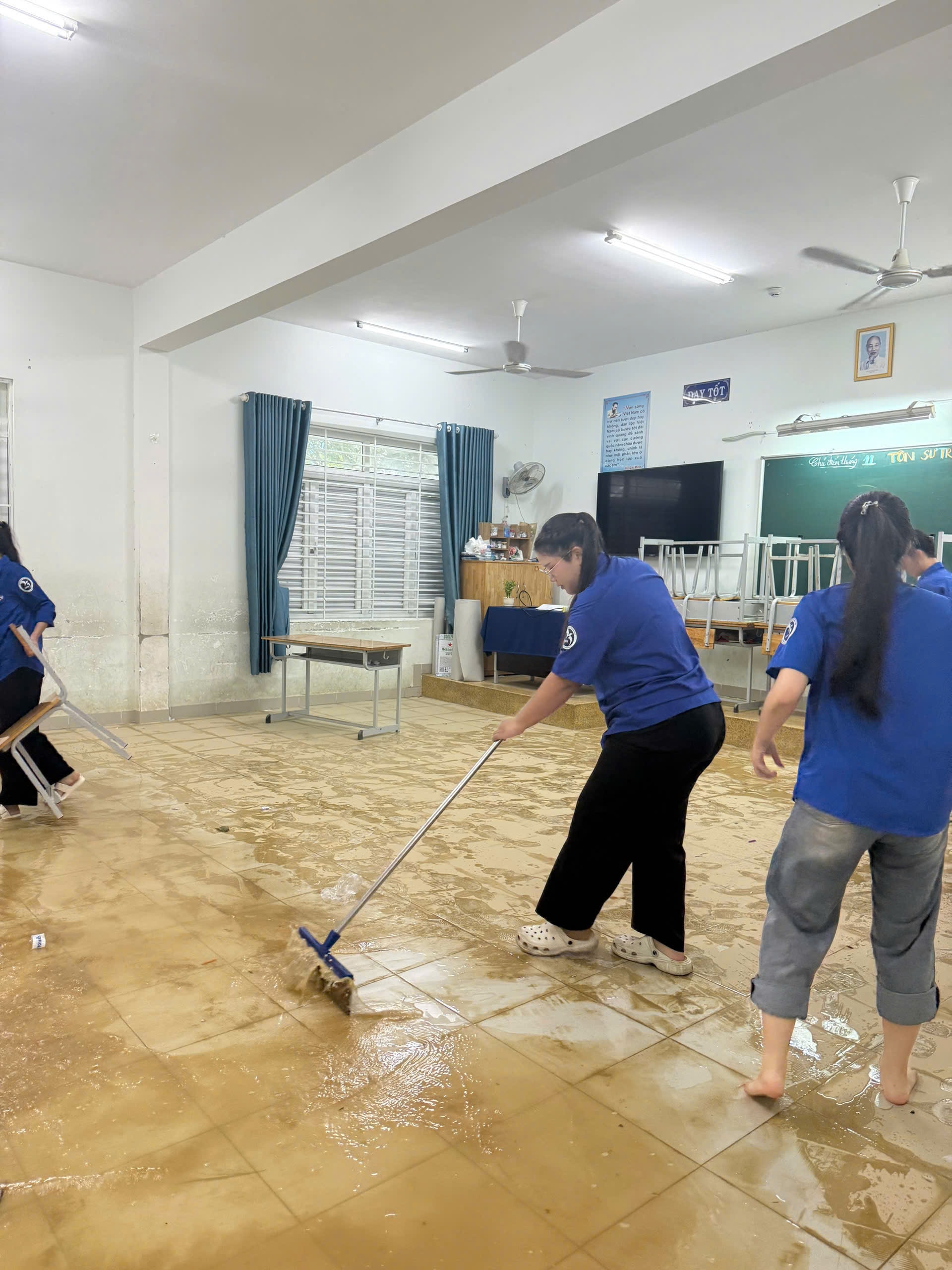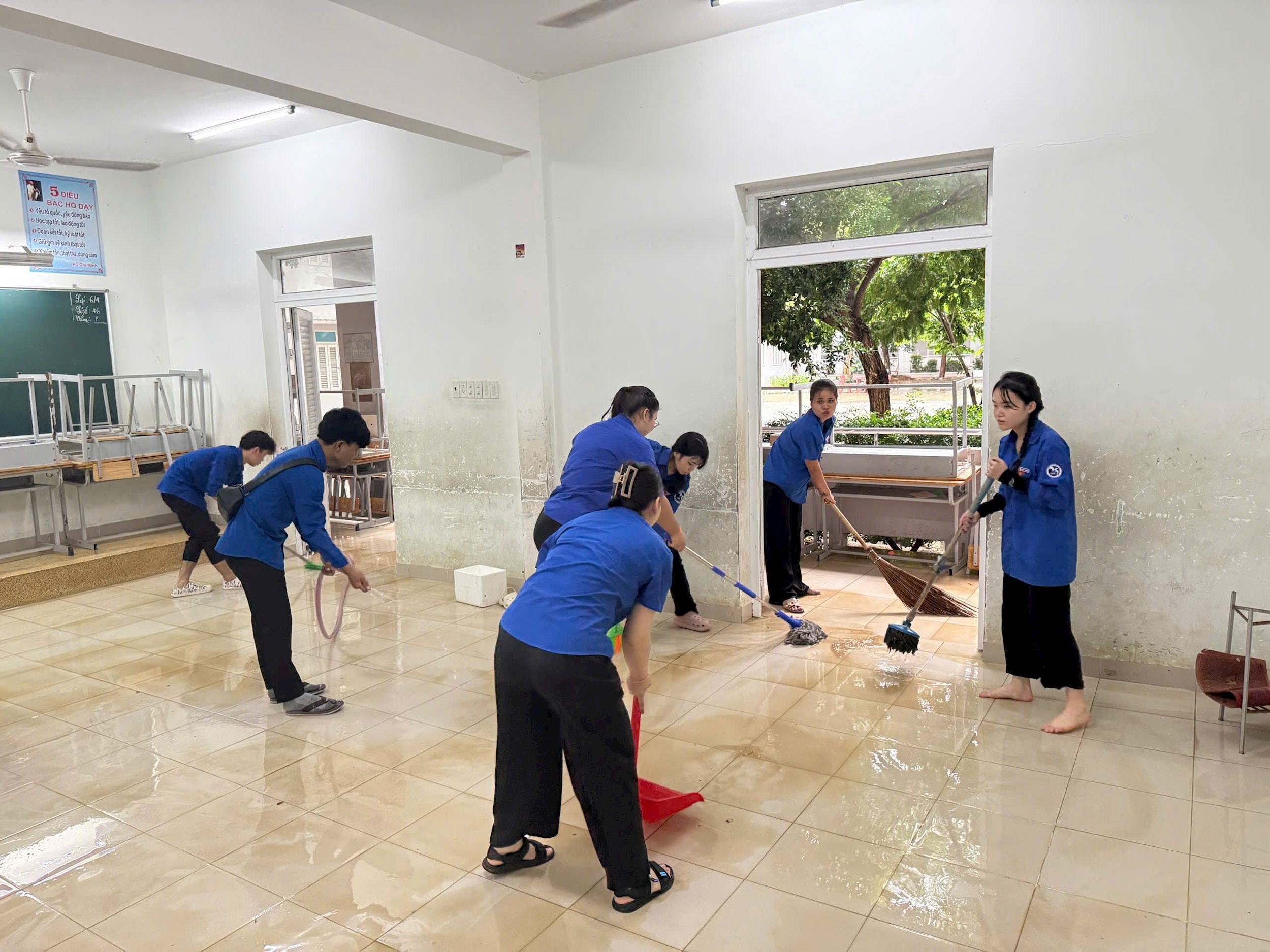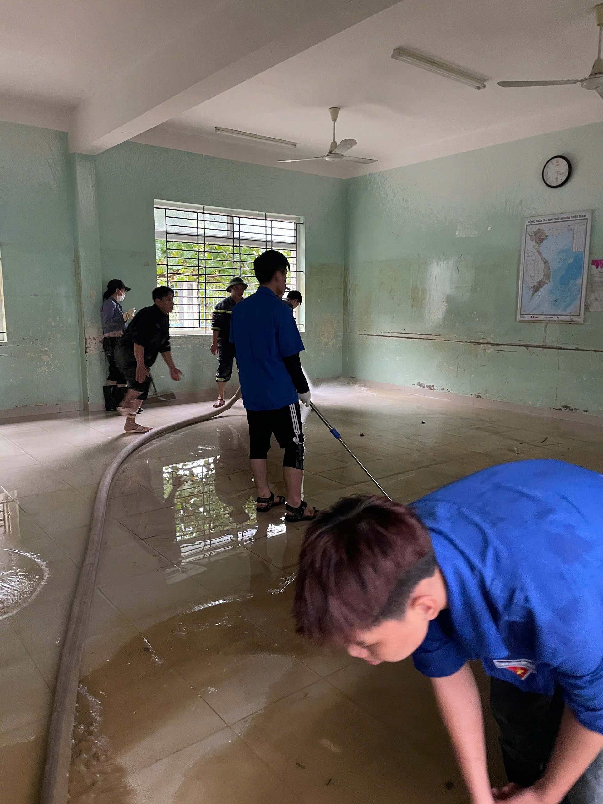 Thực tế tại các địa phương, hoạt động tình nguyện không chỉ dừng lại ở việc làm sạch đường phố hay khơi thông hệ thống thoát nước. Những đội hình thanh niên xung kích còn có mặt tại các trường học, dọn dẹp phòng học, lau sạch bàn ghế, sắp xếp lại sách vở để thầy trò có thể sớm trở lại trường.